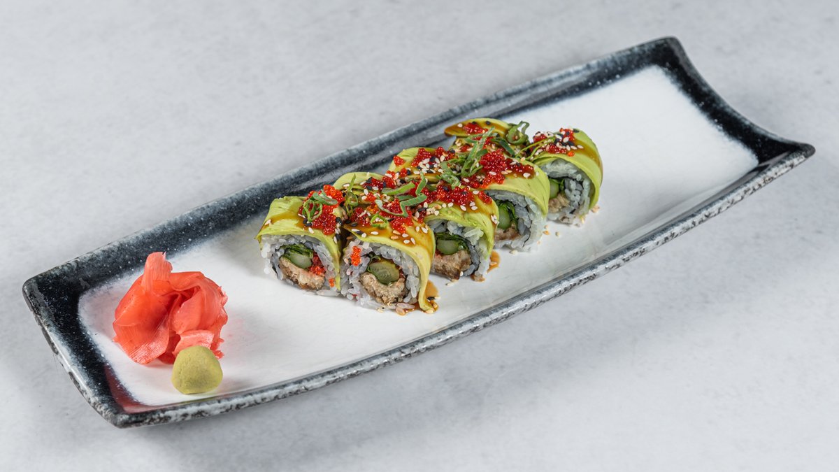 Špargla, marinirani bakalar, avokado, rukola, teriyaki, tobiko, mladi luk i susam