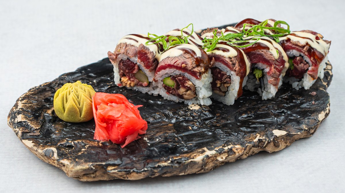 (Tatar biftek sa shitake pečurkama, šparglom, wasabi mayonezom i teriyaki sosom)