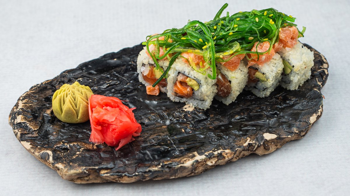 (Marinirani losos, avokado, mladi luk, wasabi majonez, wakame goma)