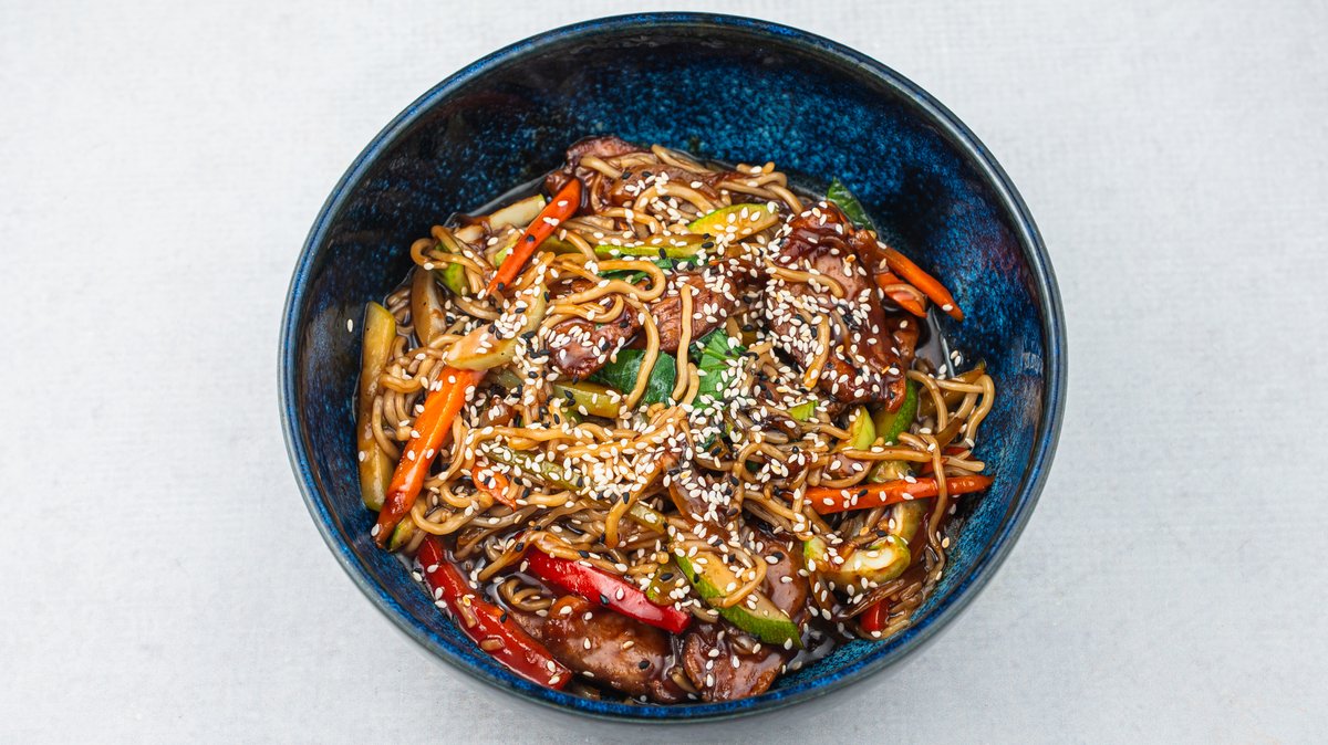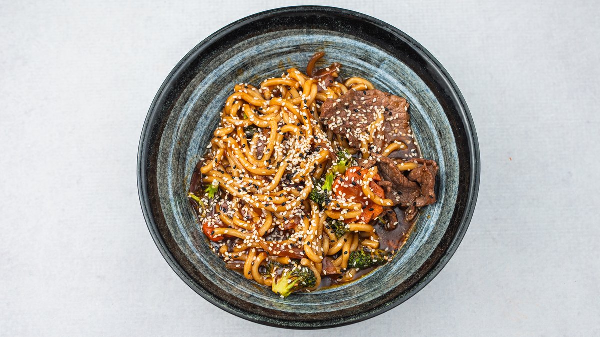 (Juneći ramstek, crveni luk šargarepa, brokoli, udon nudle i sos na bazi junetine i soje)