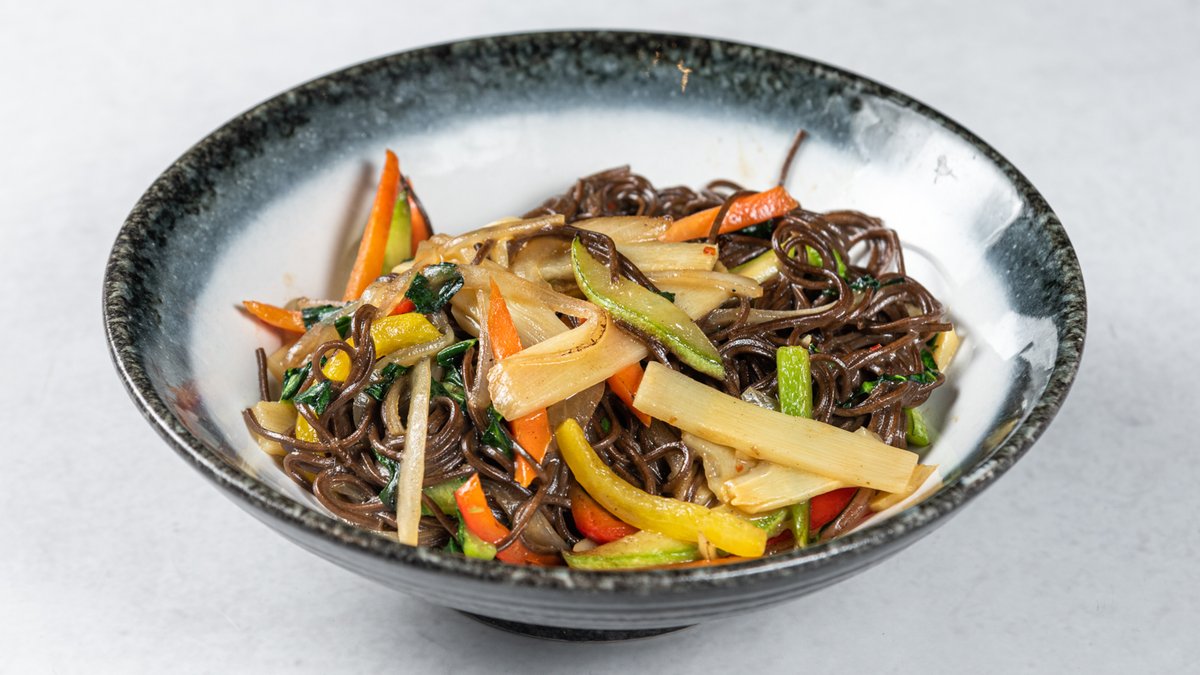 (Japasnke heljdine nudle sa mixom povrća, bok choy-em, bambo shoots-om, susamom, mladim lukom i sosom na bazi pasulja i soje)