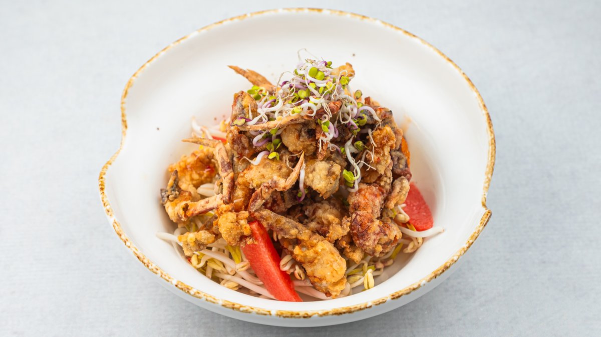 (Začinjena fritirana kraba na salati od svežih klica, ljutom papričicom, segmentima grejpa i sweet-chilli sosom)