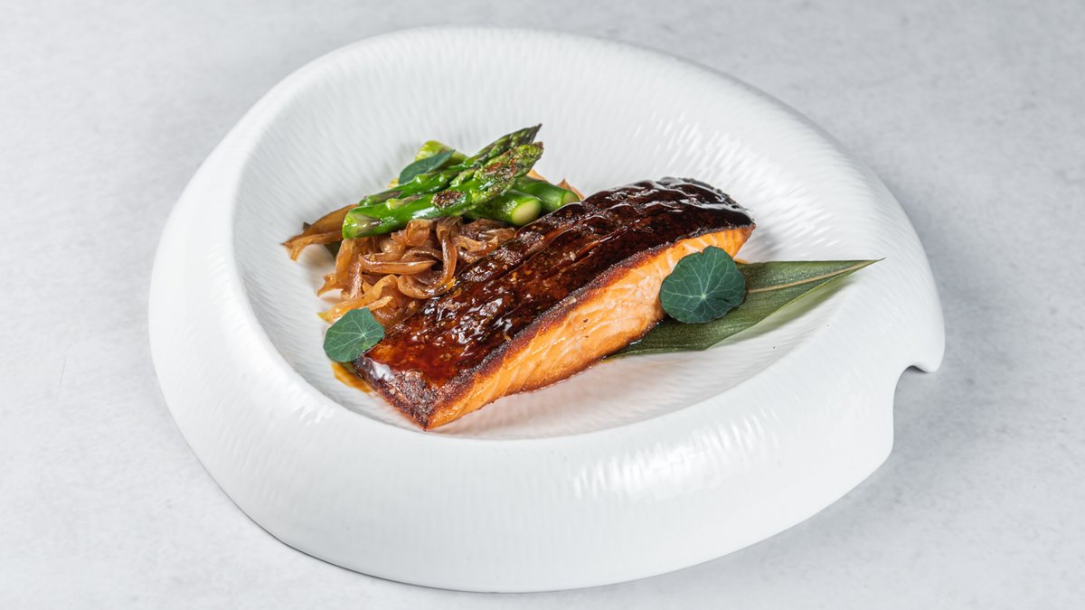 (Filet lososa sa ponzu lukom i šparglama, serviran u listu od bambusa sa teriyaki sosom)