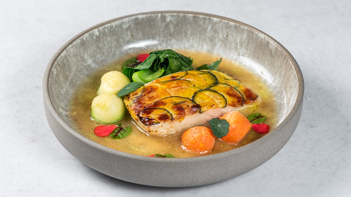 (Začijeni filet halibuta sa dve vrste tikvica, bok choy-em, šargarepom, prokeljom na sosu od limunske trave)