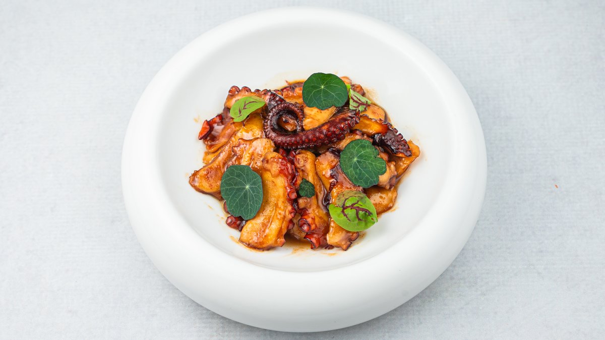 (Ukuvana hobotnica u sosu na bazi soje i meda servirana uz salatu od krastavca i manga)