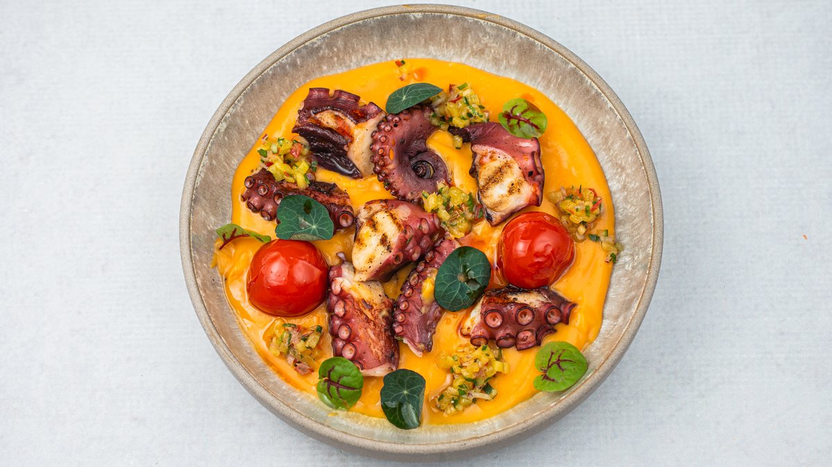 (Hobotnica servirana na pireu od batat krompira i naradže sa konfitiranim čeri paradajzem i mango salsom)