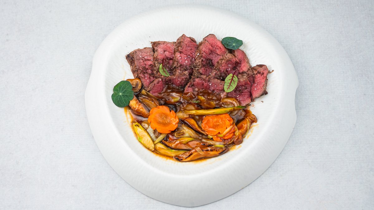 (Marinirani juneći file sa shitake pečurkama, povrćem, teriyaki sosom i crnim tartufima)