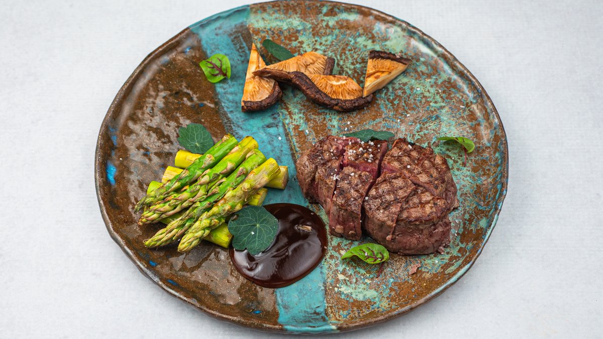 (Juneći file serviran sa grilovanom šparglom, shitake pečurkama i terijaki sosom)