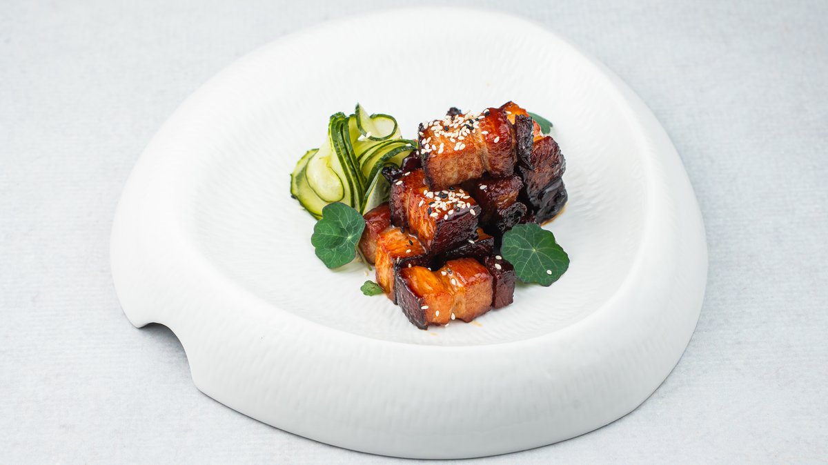 (Kockice svinjskog stomaka servirane uz kiseli krastavac i sa glaziranom šargarepom)