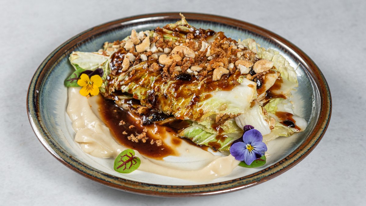 (Kineski kupus glaziran u sosu na bazi misa i toban chillija, serviran na musu od karfiola sa hrskavim lukom, susamom, korijanderom i mladim lukom)