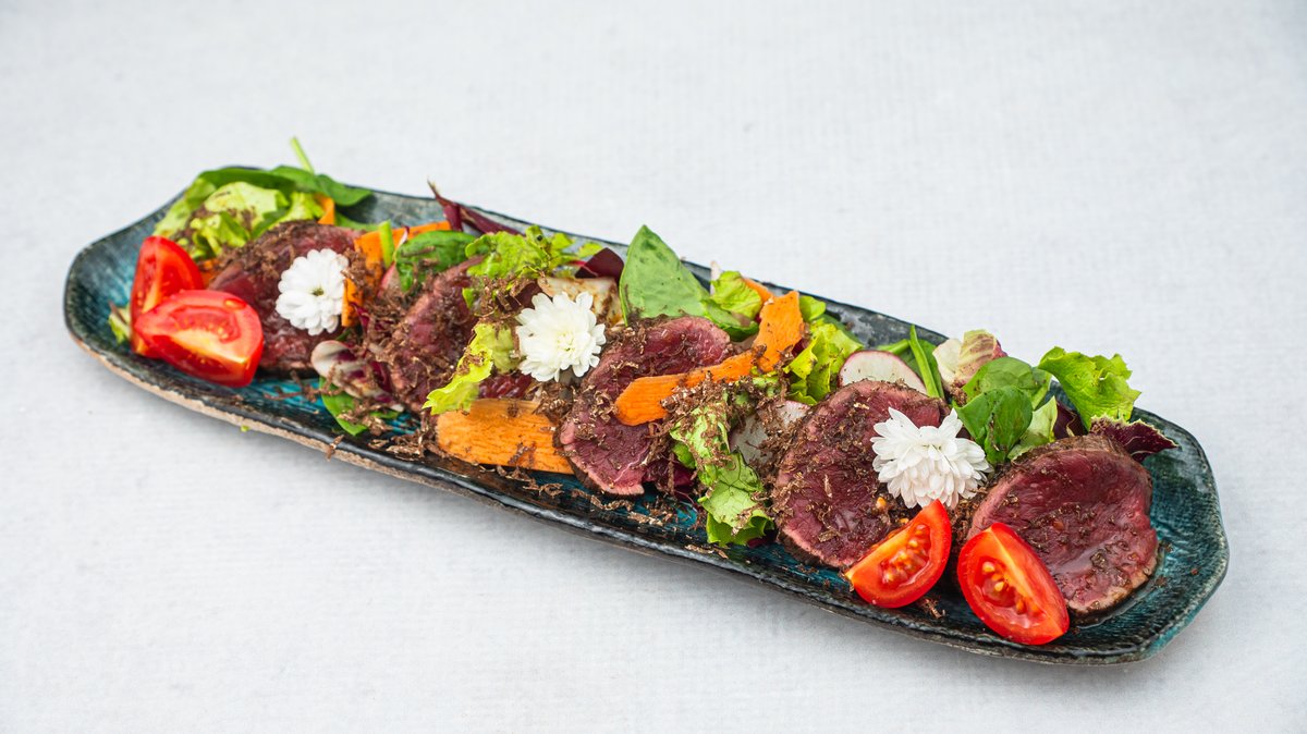 (Opečen marinirani biftek sa tartufima, serviran na mixu salate i čeri paradajzom)