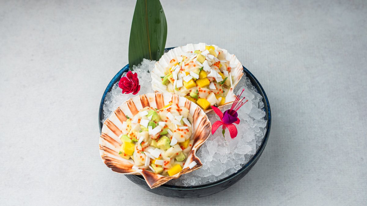 (Saint jacques kocke servirane sa mangom, avokadom, kokosom, crvenim lukom, tobicom i dresingom na bazi limete i maslinovog ulja)