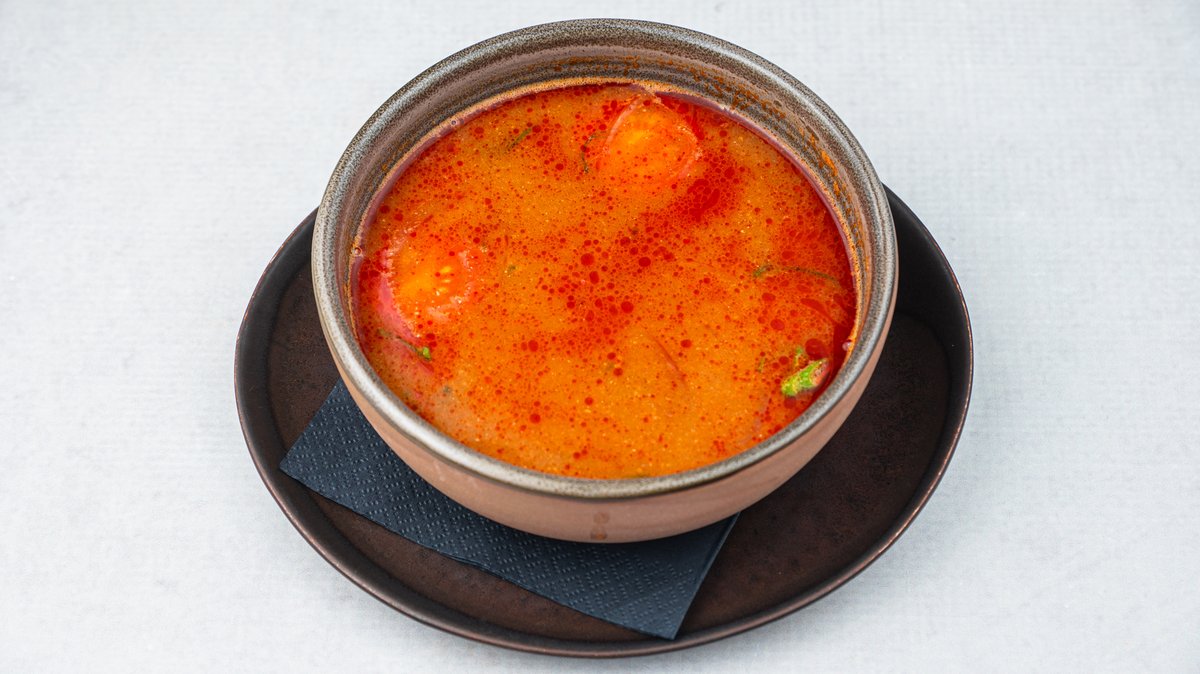 (Blago kiselo - ljuta supa sa Black Tiger gamborima, čeri paradajzom, ''straw'' pečurkama, korijanderom i mladim lukom)
