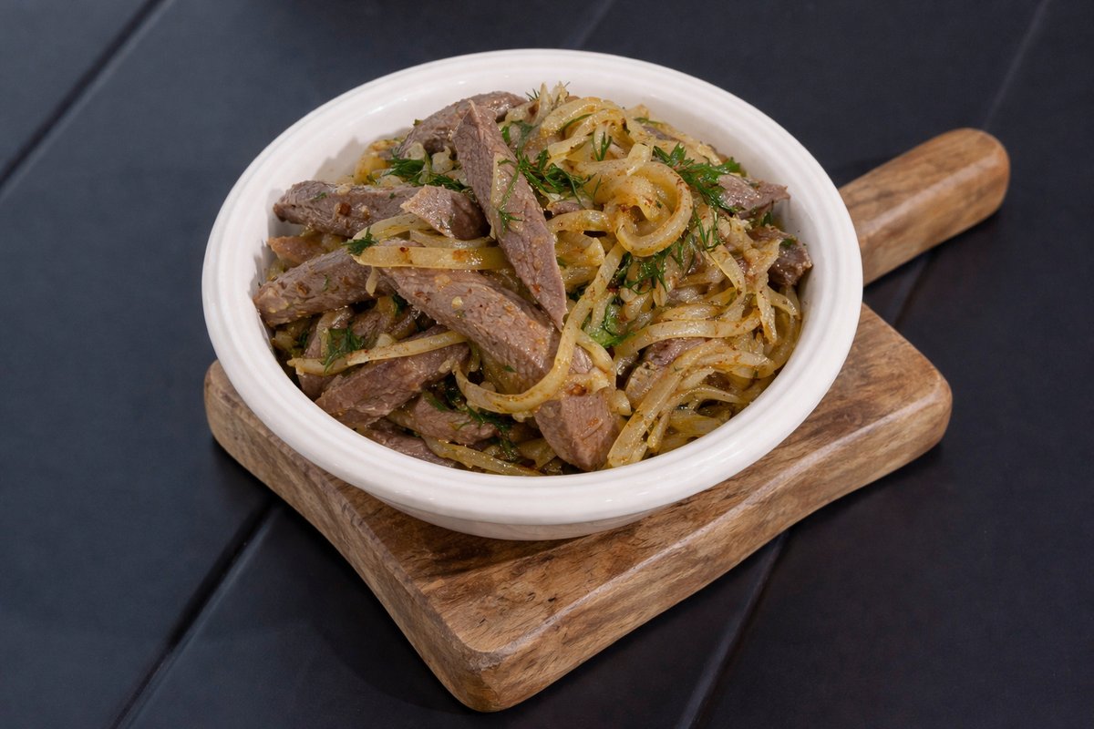 Goveđi jezik, beli luk, ulje, so, šećer, sirće, začini, korijander, crni luk -Язык говяжий,чеснок, масло, соль, сахар, уксус, специи,кинза,лук 200gr