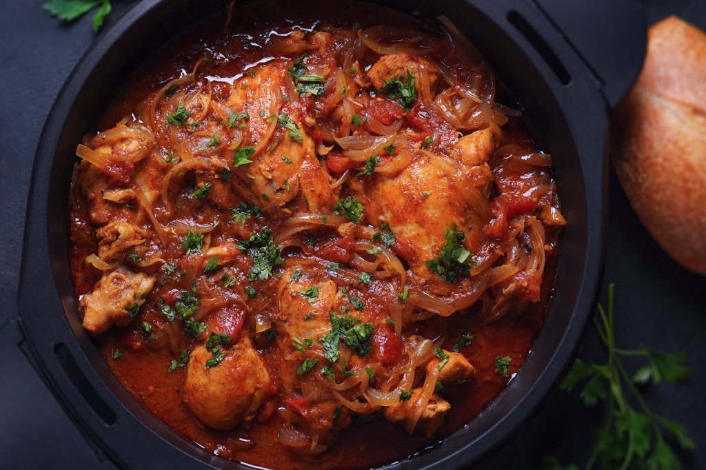 Cahohbili - ukusno glavno jelo od dinstanih pilećih bataka u sočnom paradajz sosu sa crnim lukom.