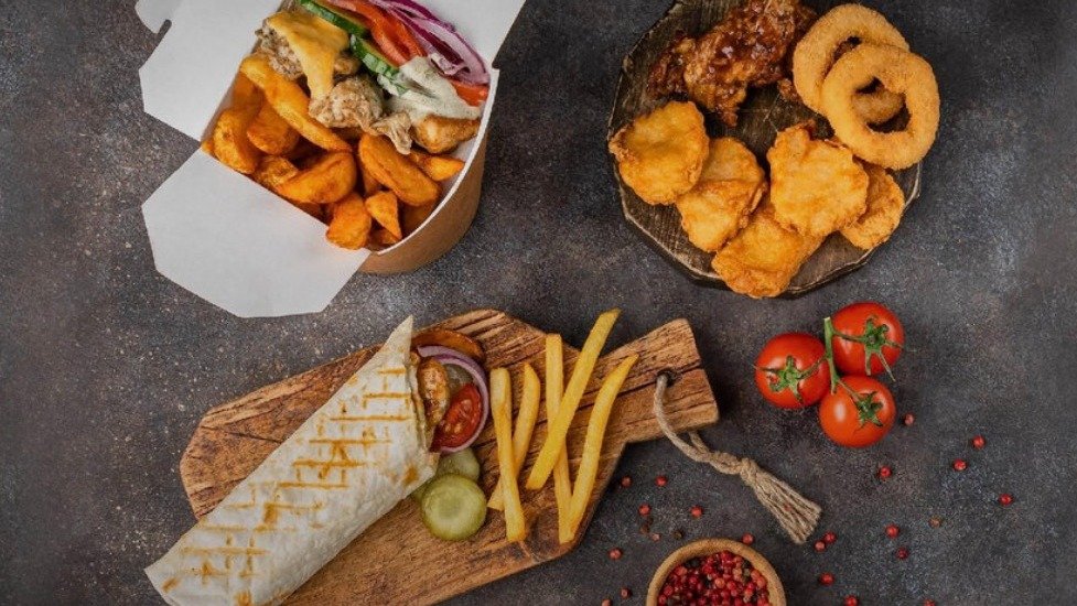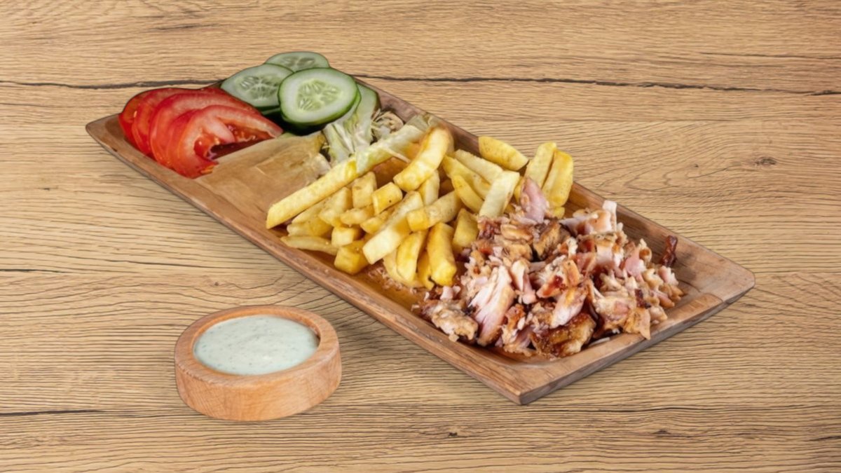 Marinirano pileće meso, pomfrit, kupus, krastavac, paradajz, sos od belog luka, paradajz sos