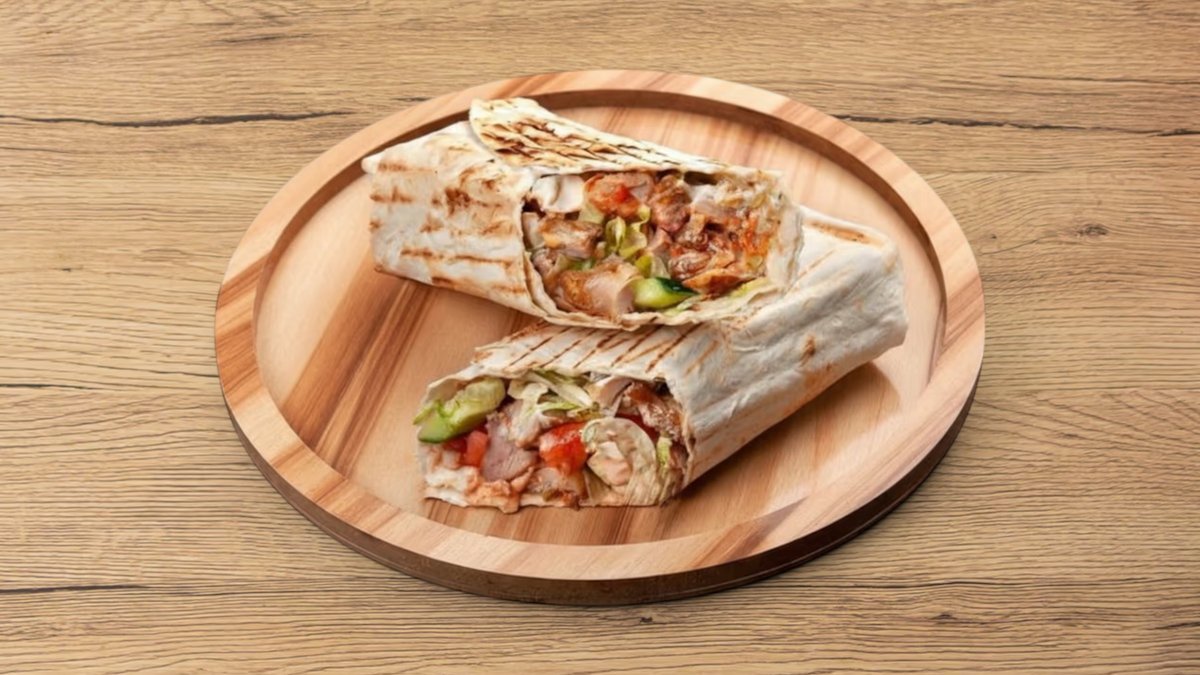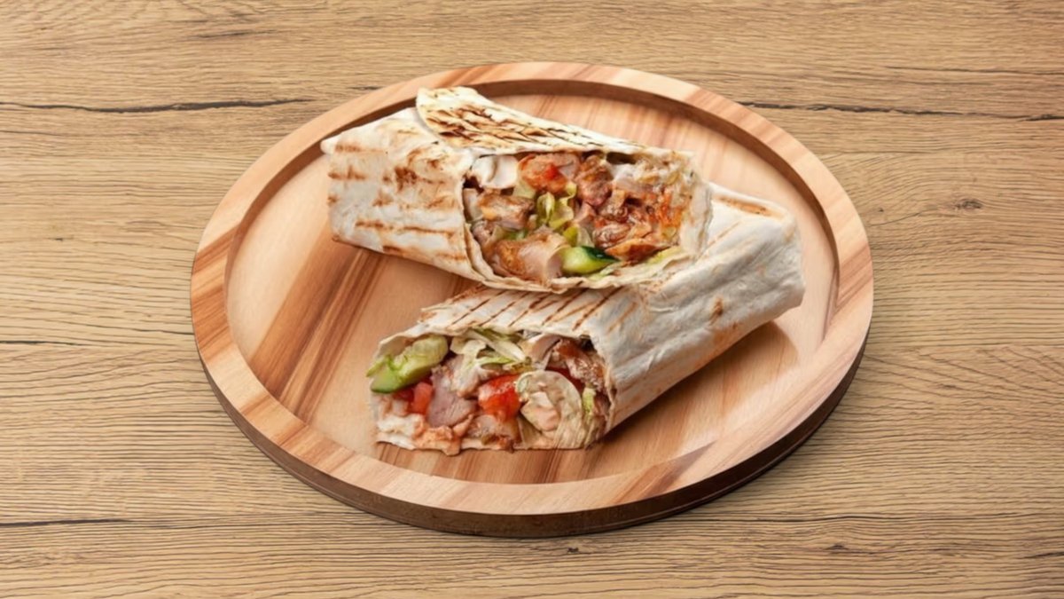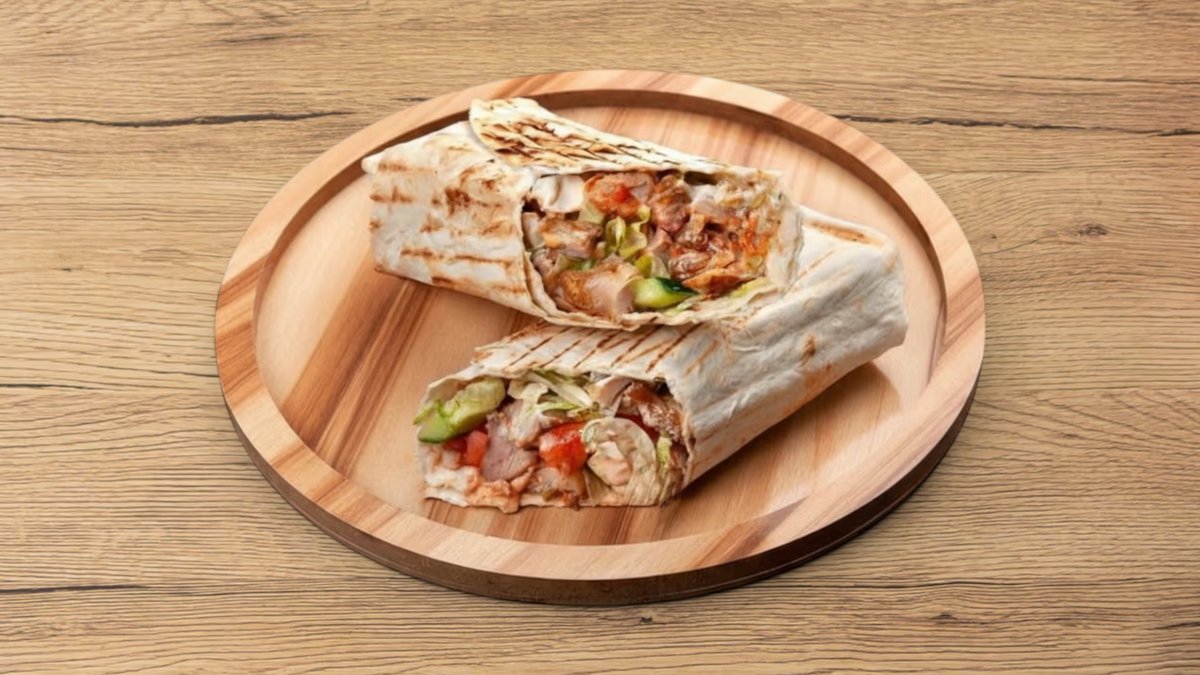 Tortilja, marinirano pileće meso, kupus, krastavac, paradajz, korejska šargarepa, sos od belog luka, paradajz sos