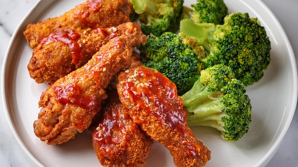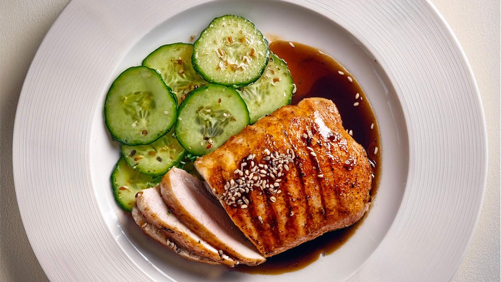 Ovaj pileći file, pažljivo je mariniran u bogatom pacu i brižno izabranim začinima, pripremijen je na toplom vazduhu, bez upotrebe ulja, čime zadržava prirodnu sočnost i hrskavost, a istovremeno ostaje zdrav izbor. Uz njega dolazi krastavac salata koja je odlezala u aromaticnoj marinadi sa dodatkom Koreanskih začina, pruzajući laganu i osvežavajuću dimenziju. Krastavac je u obroku preliven sosom sa korejskim začinima, koji pruza bogat, pikantan ukus bez prekomerne ljutine. Ovaj obrok je savršen spoj zdravlja i ukusa, za one koji traže laganu, ali hranjivu opciju.