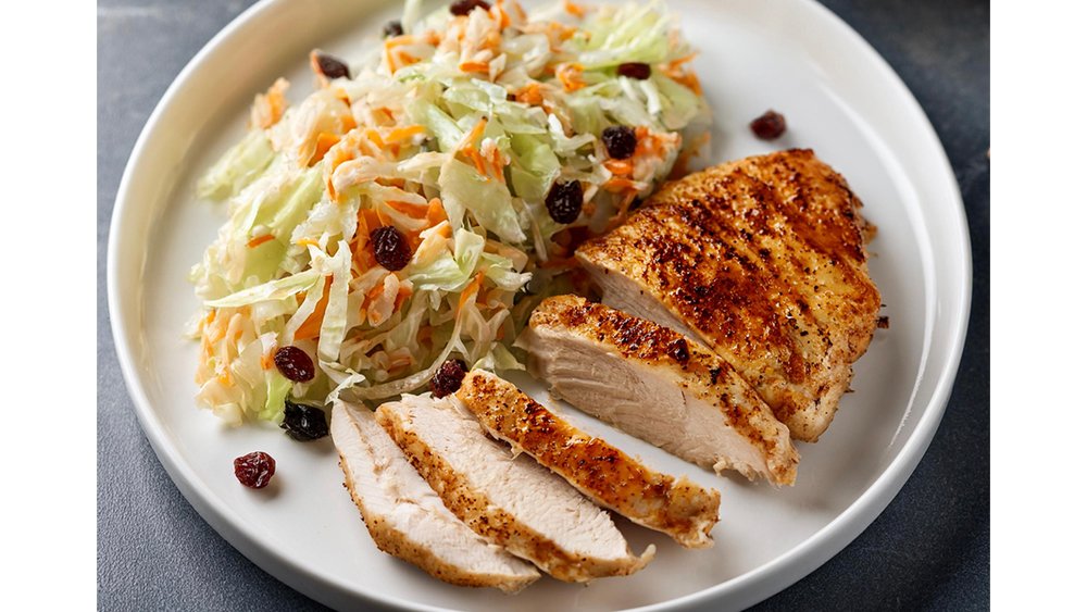 Pažijivo mariniran pileći file, prepun bogatstva začina, pečen na toplom vazduhu bez ulja kako bi zadržao prirodnu sočnost i mekoću. Uz njega dolazi sveža coleslaw salata, napravijena od sitno seckanog kupusa, cija hrskavost osvežava svaki zalogaj. Domaći coleslaw sos, pripremijen je od kremastog jogurta, blagog majoneza i kapljice svezeg limunovog soka, dodaje harmoniju ukusa, vezujući nežnu teksturu mesa s osvežavajucom hrskavošću salate. Završni dodir pruža mala porcija zlatno pečenog pomfrita na toplom vazduhu bez upotrebe ulja, čineći ovo jelo balansiranim spojem kremastog, hrskavog i sočnog užitka.