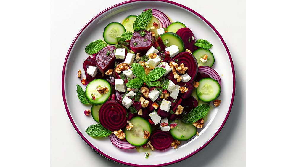 Ova osvezavajuća obrok salata donosi prirodne ukuse u najboljem izdanju! Kombinacija sveže cvekle, krastavca i crvenog luka prelivena je domaćim dresingom od nane i maslinovog ulja, koji unosi laganu aromu i osveženje. Savršeno upotpunjena komadićima fete i pažljivo seckanim orasima, ova salata je prava simfonija ukusa i tekstura. Idealna za lagan, zdrav i ukusan obrok!