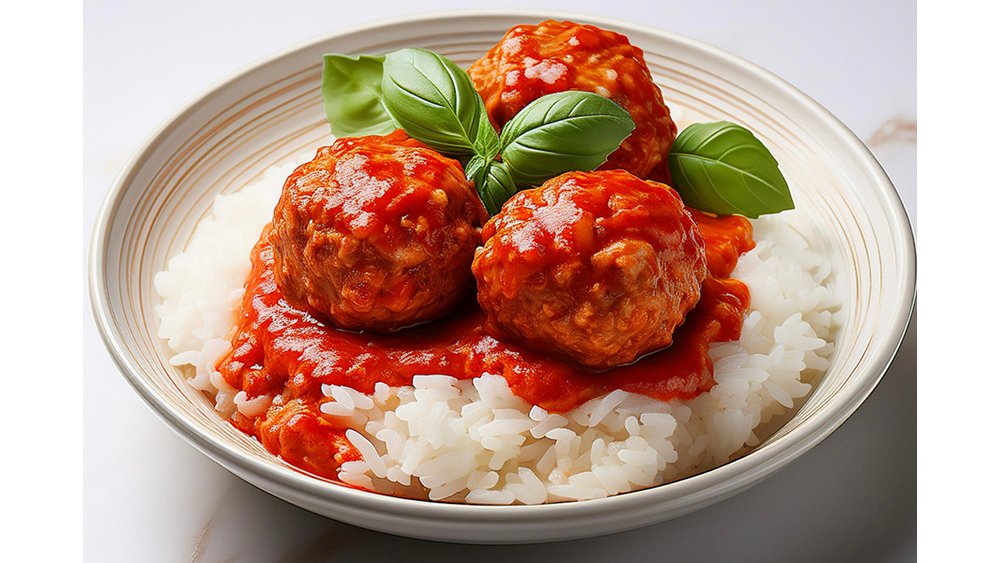 Obrok Pileće Kuglice od Mlevenog Filea na pirinču sa crvenim sosom