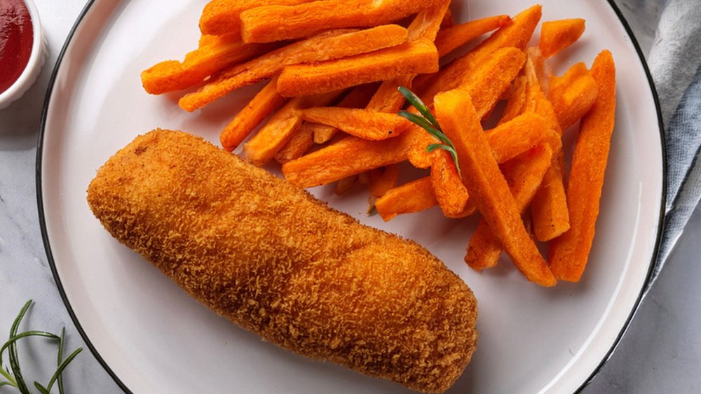 Prva bez ulja pripremljena Svinjska Karadjordjeva panirana šnicla sa dodatkom od pomfrit batat krompirom i Brokolijem