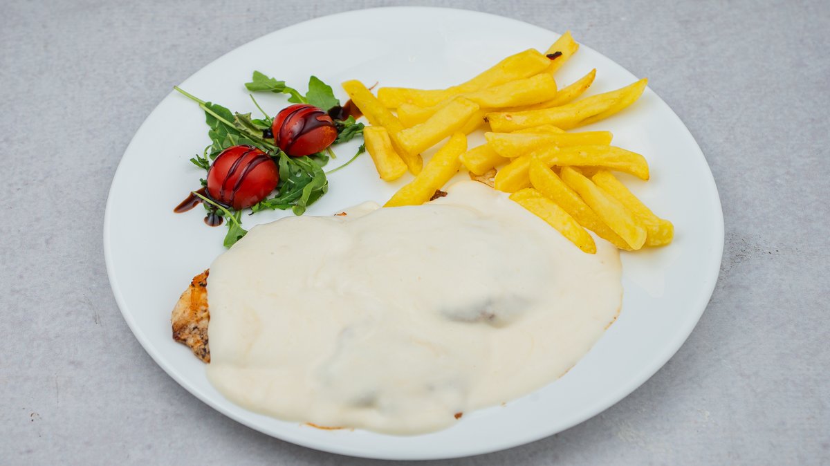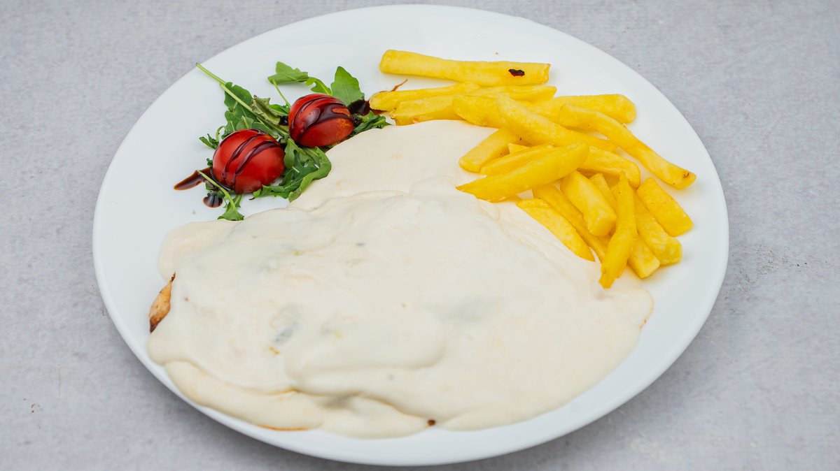 Ćureći file, neutralna pavlaka, dimljeni sir, kačkavalj, gorgonzola, parmezan, rukola, čeri