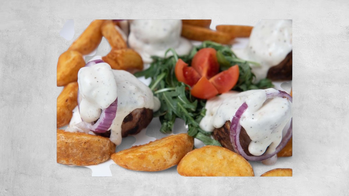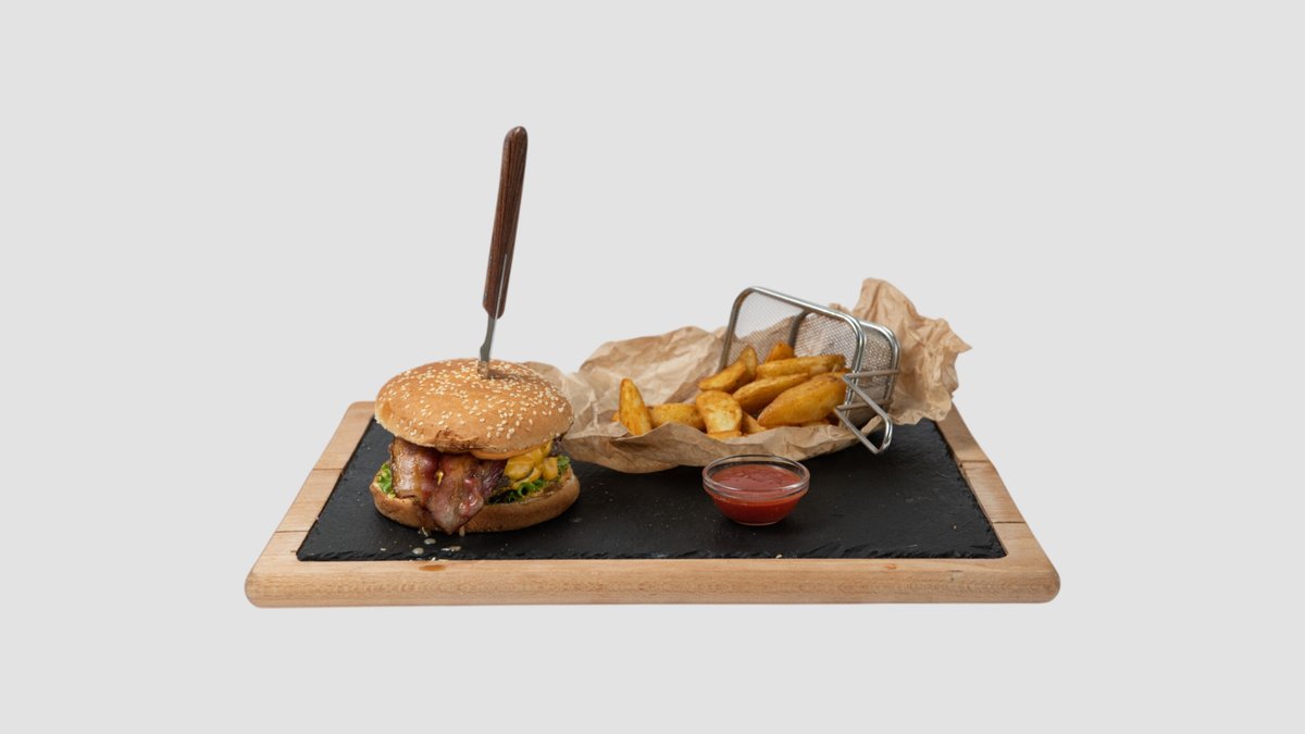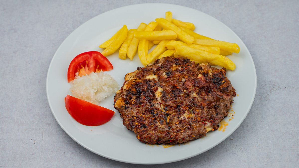 Junetina, burger sos, čedar sir, paradajz salata