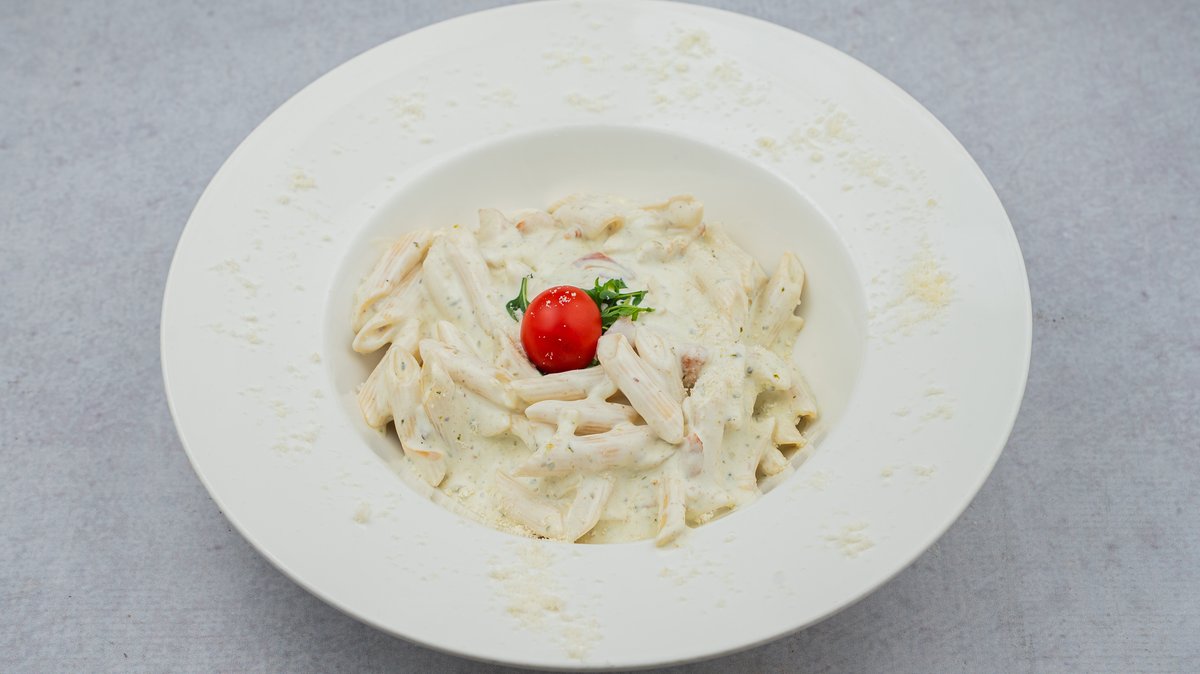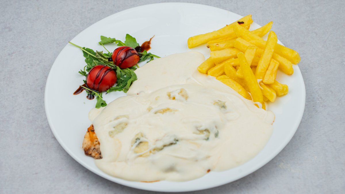 Ćureći file, neutralna pavlaka, gorgonzola sir, parmezan, rukola, čeri