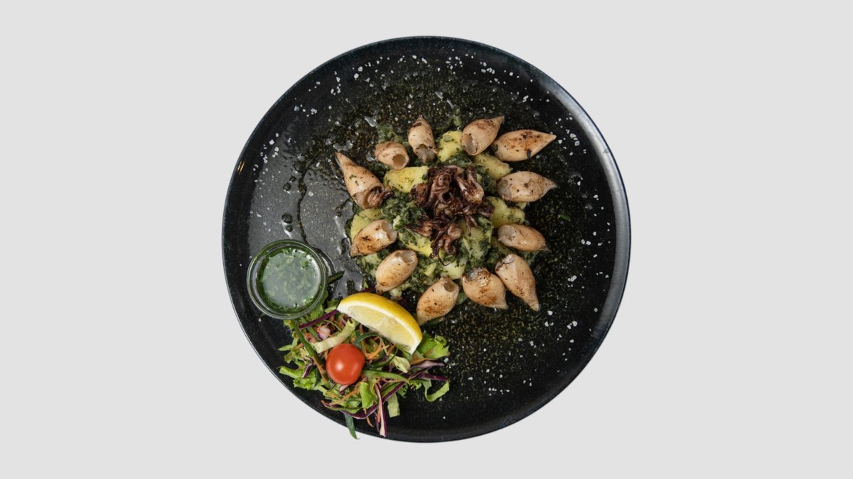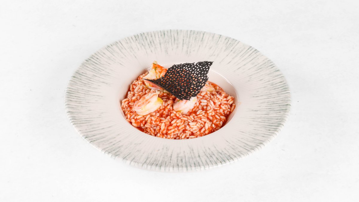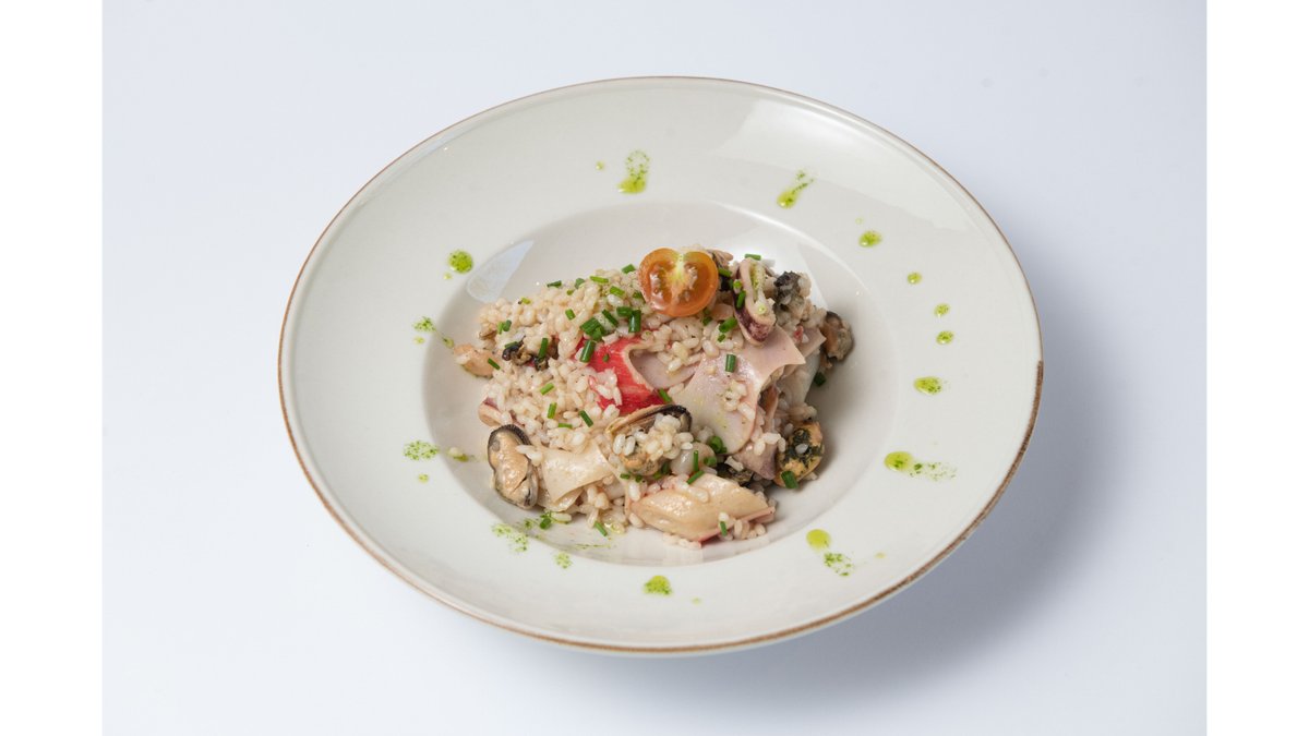 Riža, plodovi mora, pelat, belo vino, beli luk, rukola