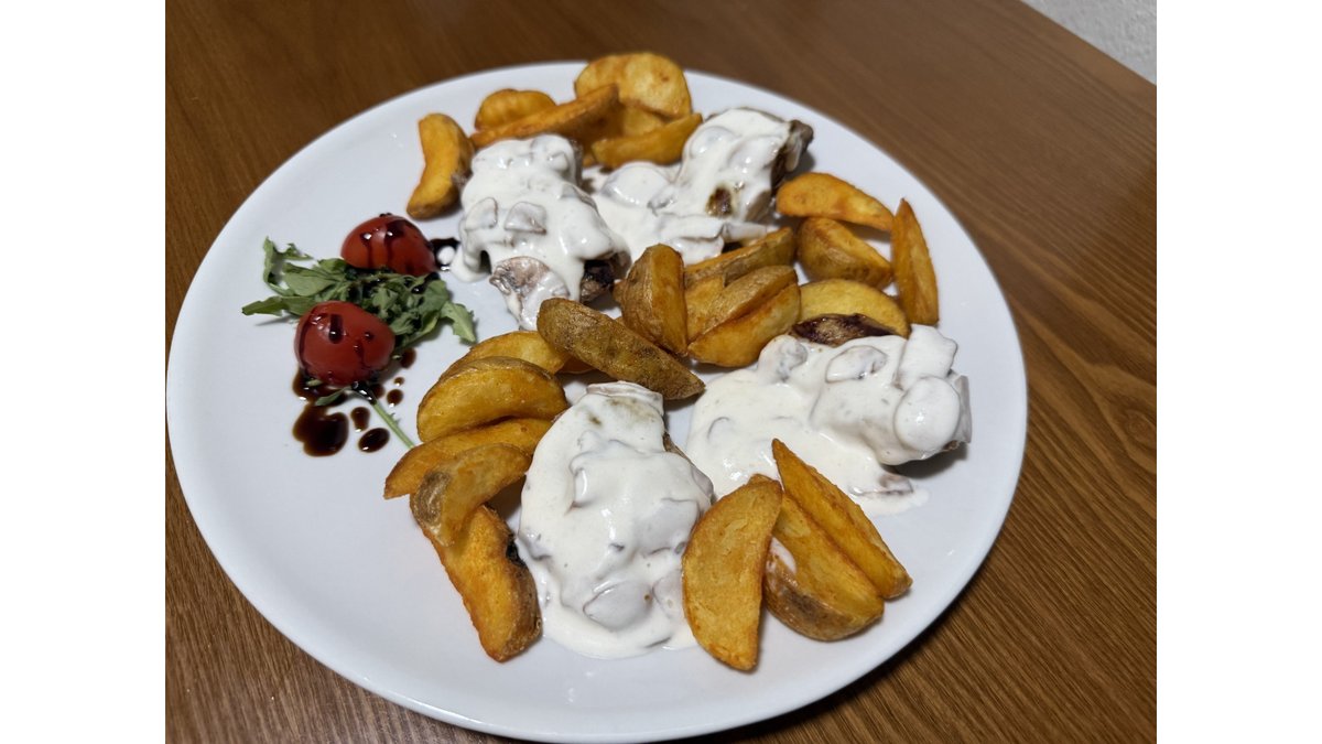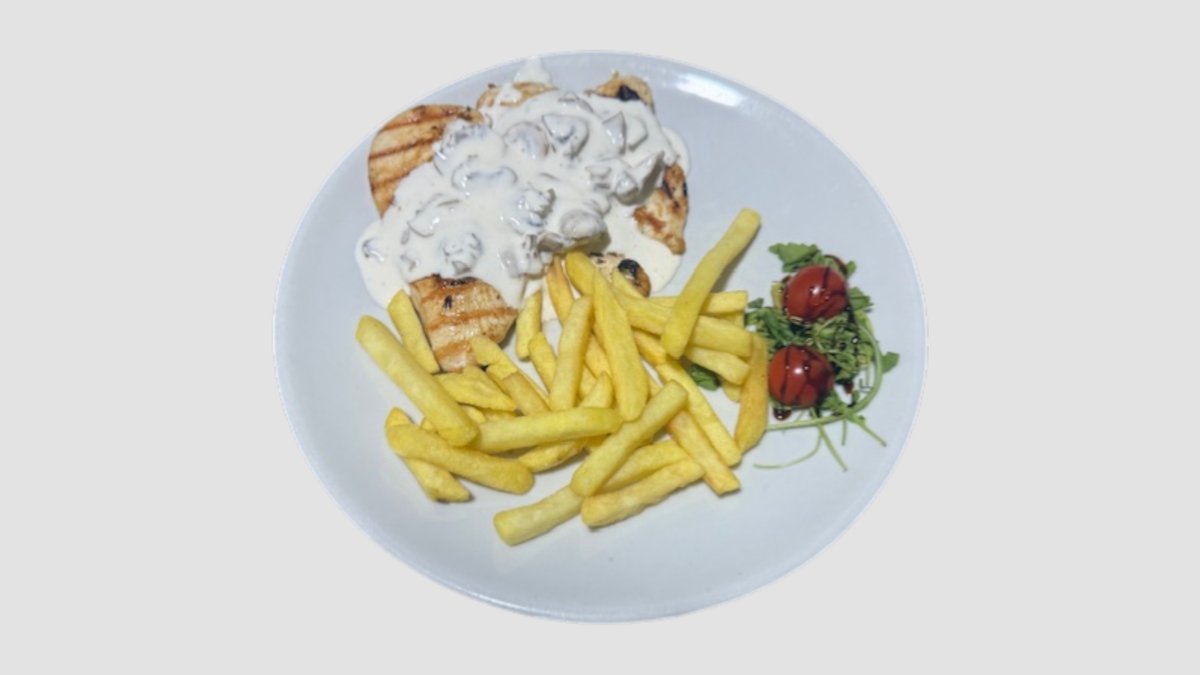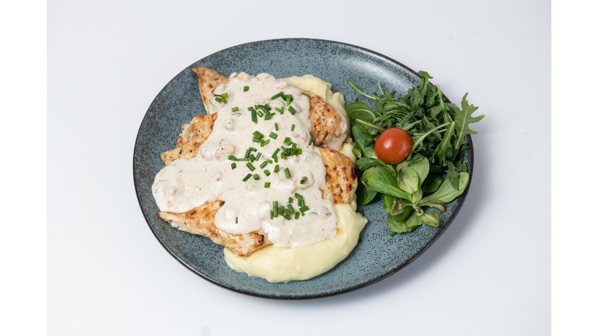 Pileći file, gambori, neutralna pavlaka, belo vino, krastavac, pire krompir