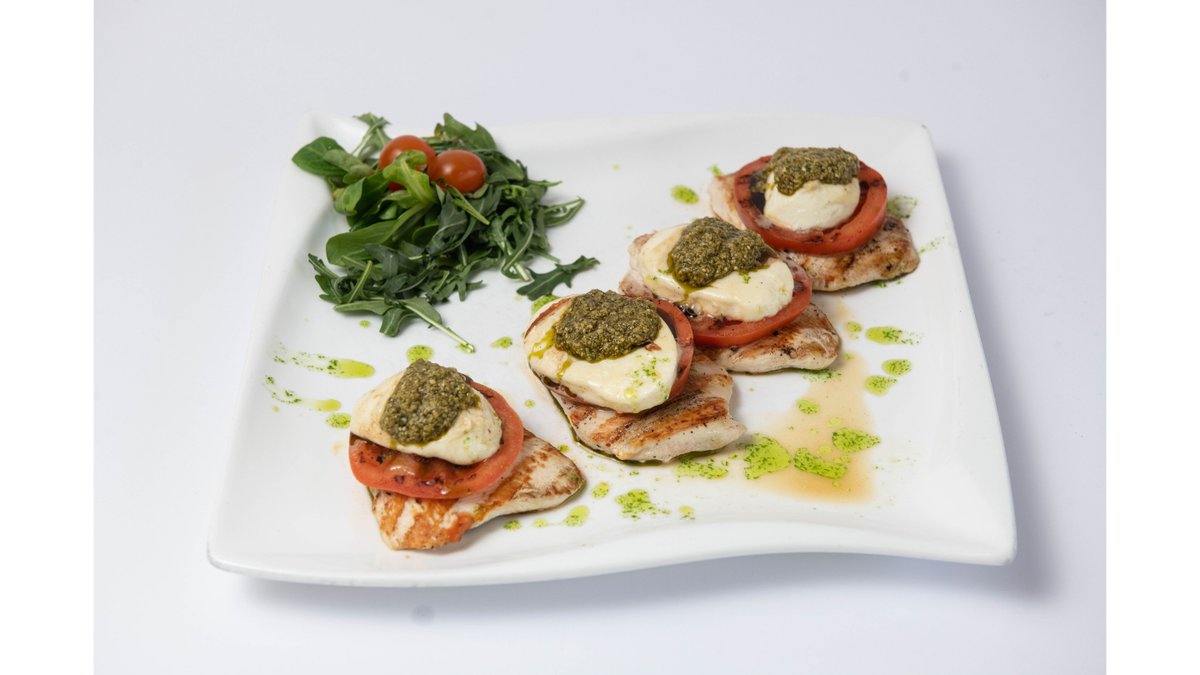 Pileći file, neutralna pavlaka, dimljeni sir, kačkavalj, gorgonzola, parmezan, rukola, čeri