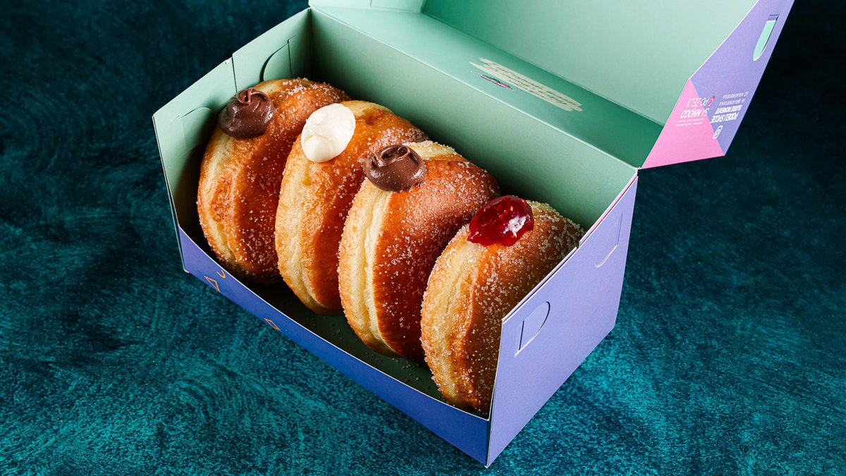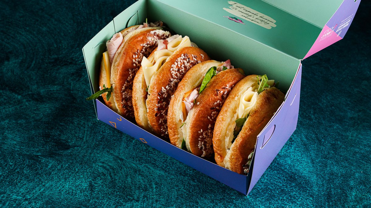 2 x Pršutica (susam, lan pršuta, sir maasdam, pesto sos, rukola, vajkrem i 2x Srpska krofna (dimljena pečenica, dimljeni kačkavalj, mustard sos, vajkrem, mix zelenih salata, susam, lan).