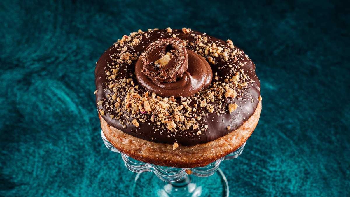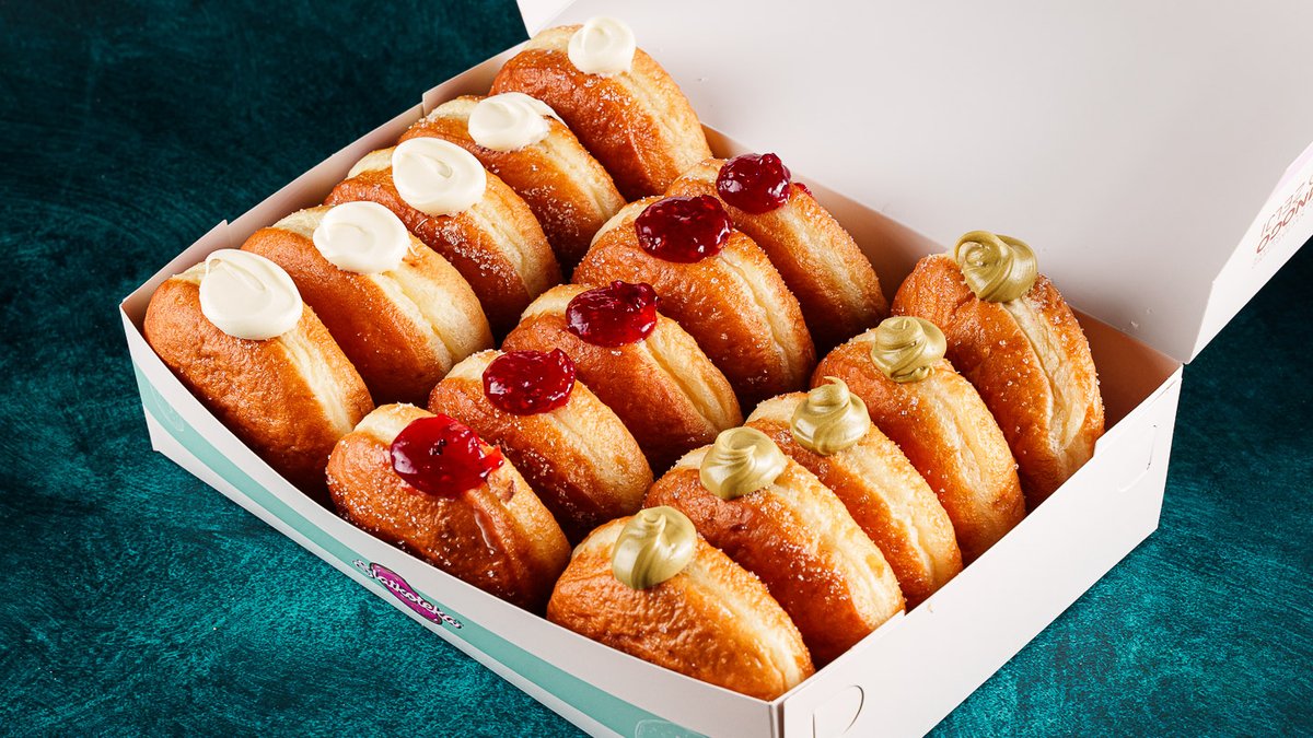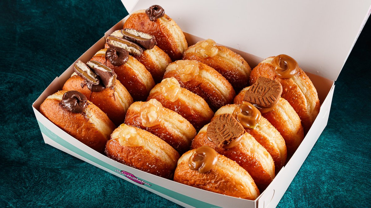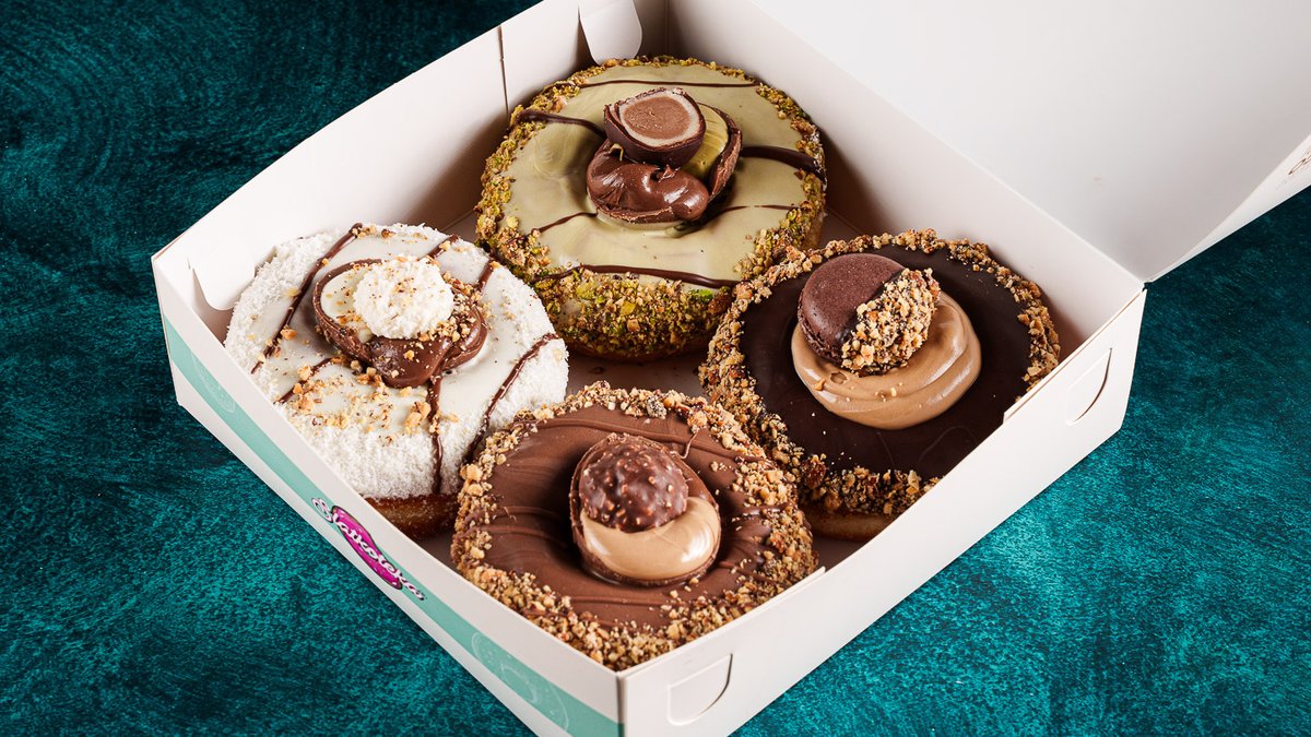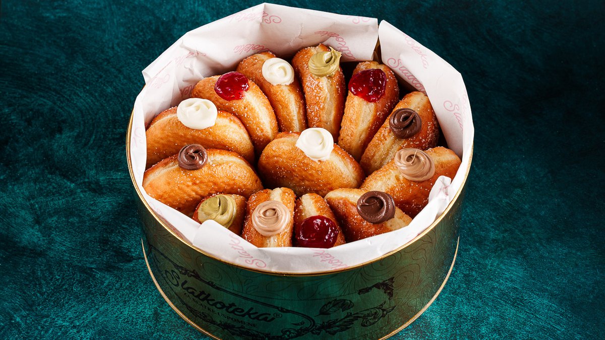 Pakovanje od 13 krofni u 5 ukusa (nugat, pistać, malina, beli kinder i lešnik) u premium pakovanju u metalnoj kutiji sa mašnom