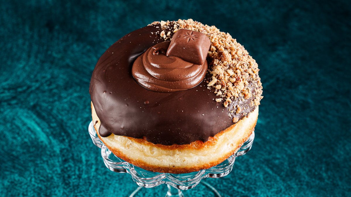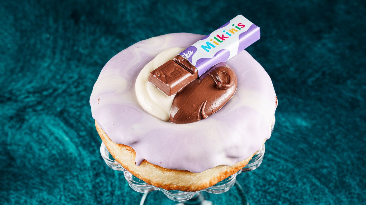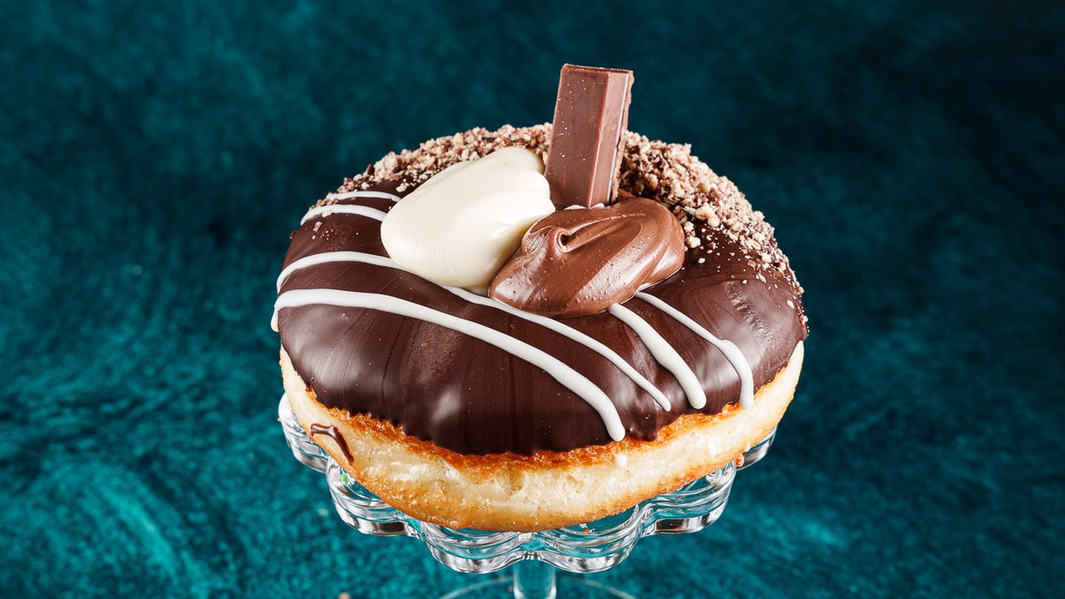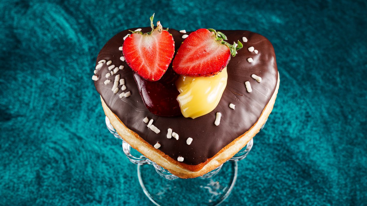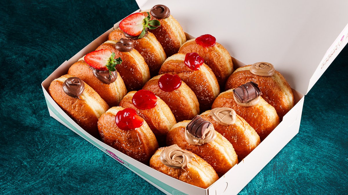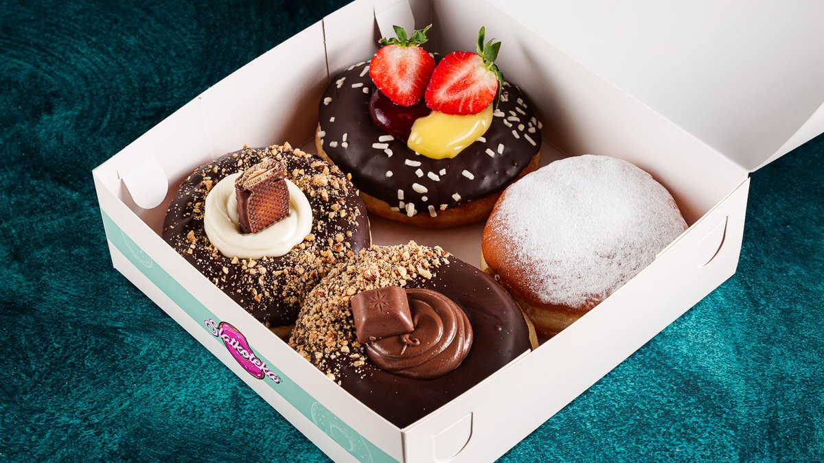 Mlečna čokolada, vanila fil, jagoda fil, malina, nana, bele čokoladne mrvice, smesa za krofne