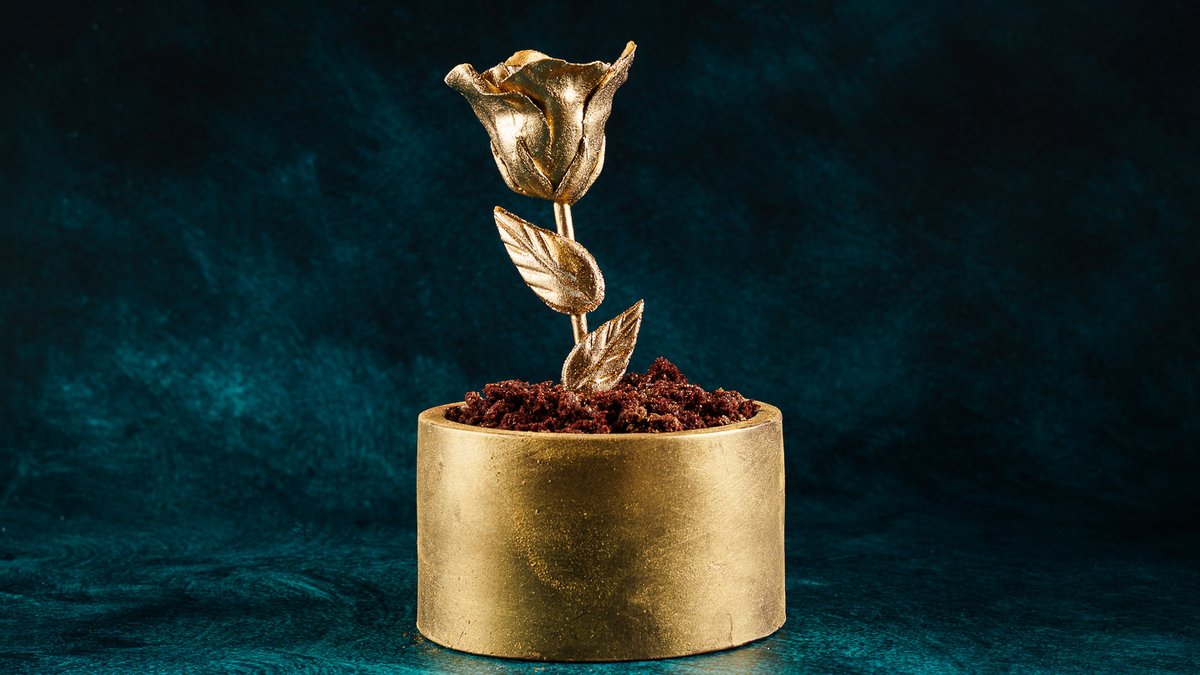 Saksija od čokolade sa kremastim punjenjem, čokoladnom brauni korom i zlatnom ružom od fondana, 650g