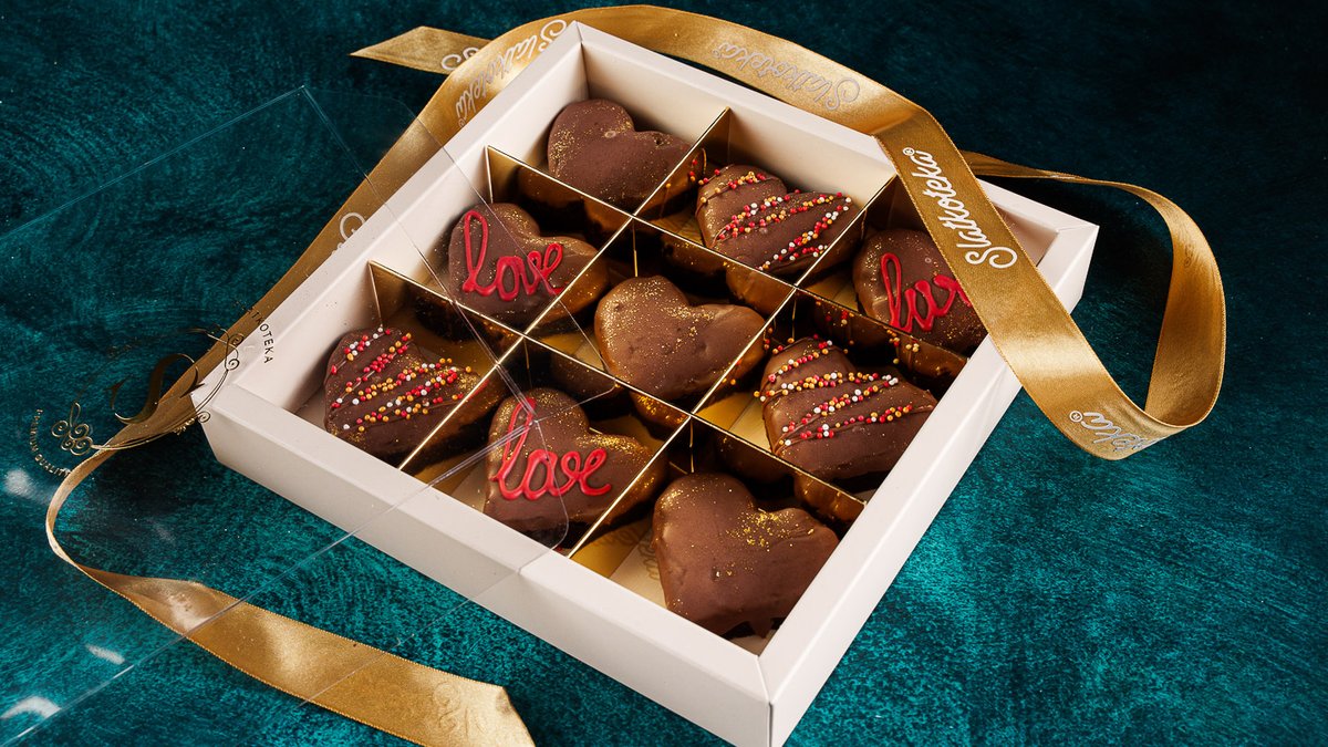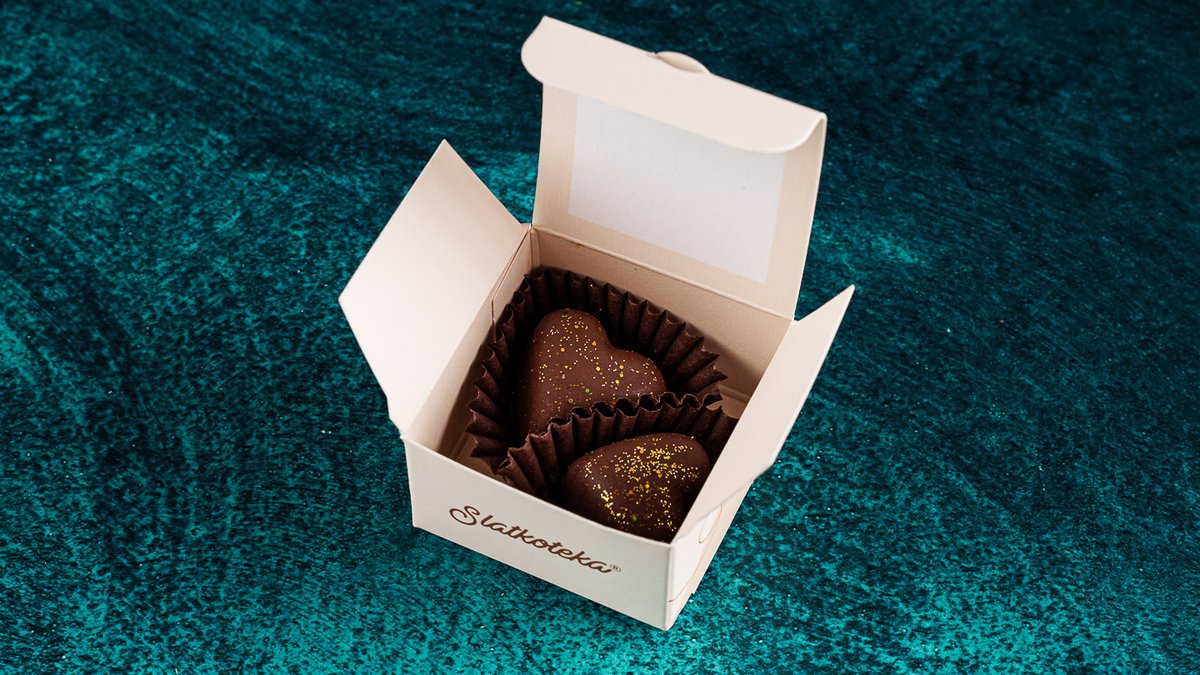 Pakovanje brauni zalogaja prelivenim čokoladom u obliku srca u kutiji koja krije skrivene poruke