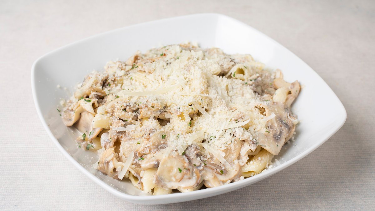 Maslinovo ulje, crni luk, beli luk u ulju, pečurke, so, biber, belo vino, neutralna pavlaka, muskatni orah, peršun, testenina, parmezan