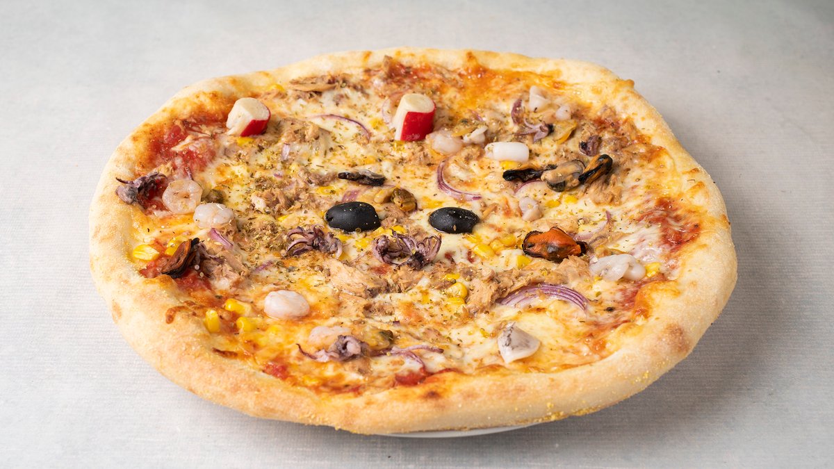 Pelat, kačkavalj, tuna, morski plodovi, crveni luk, kukuruz šećerac, beli luk, limun, masline, origano