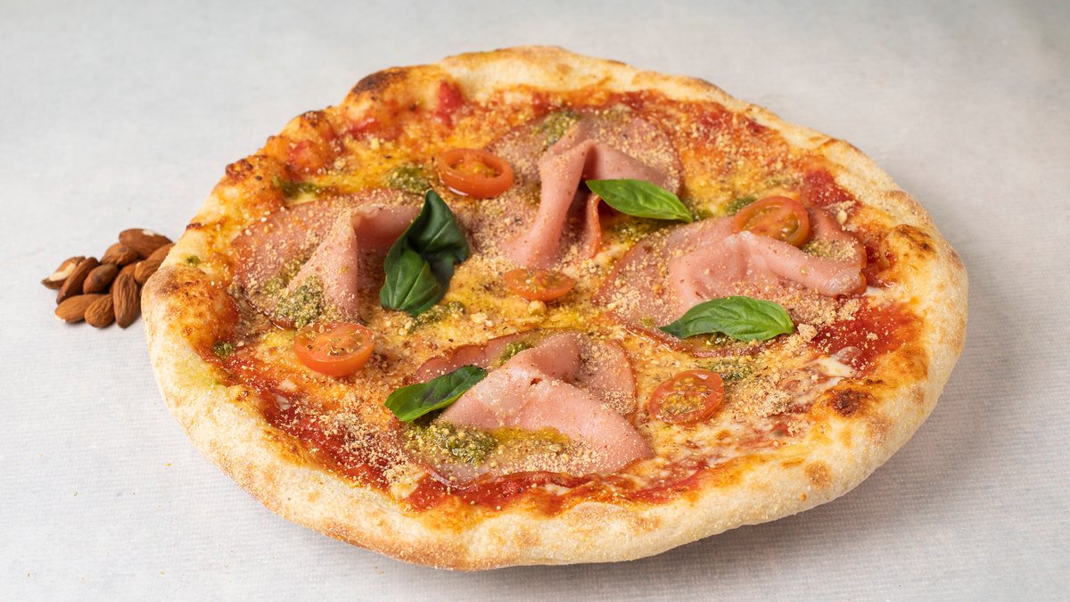 Pelat, kačkavalj, mortadela, pesto sos, badem, čeri paradajz, svež bosiljak