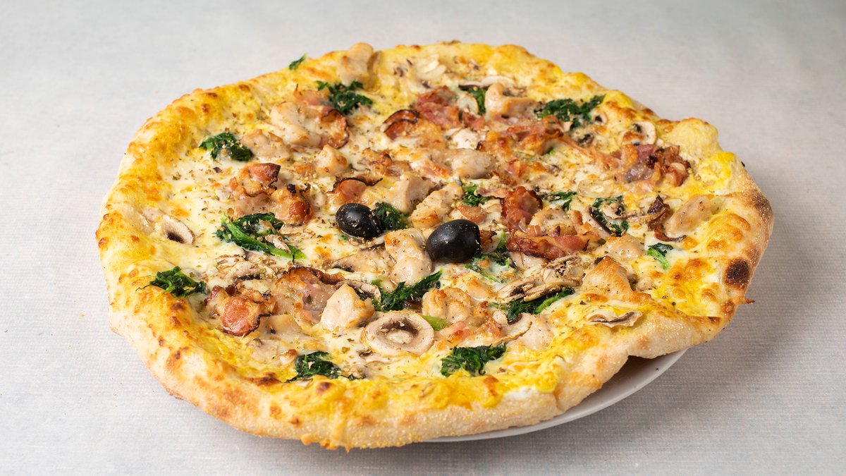 Smiley sos, kačkavalj, piletina, spanać, pečurke, masline, origano