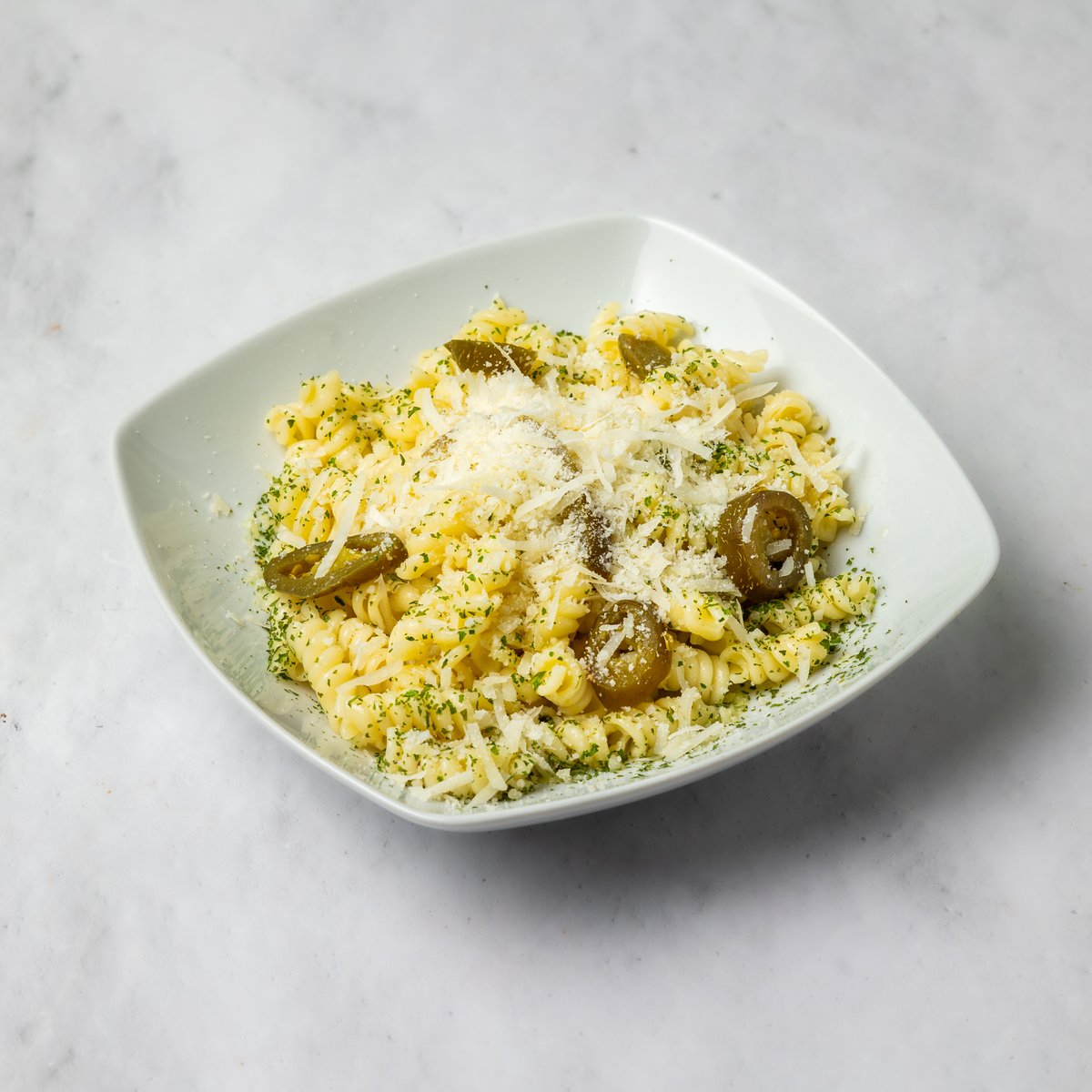 Maslinovo ulje, beli luk u ulju, jalapeno, peršun, testenina, parmezan