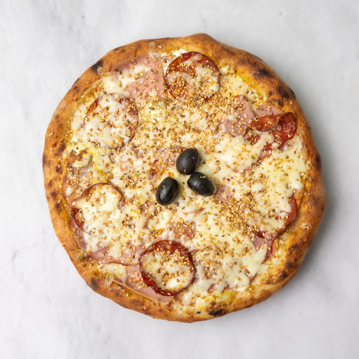 Smiley sos, kačkavalj, buđola, kulen, praška šunka, susam, masline, origano