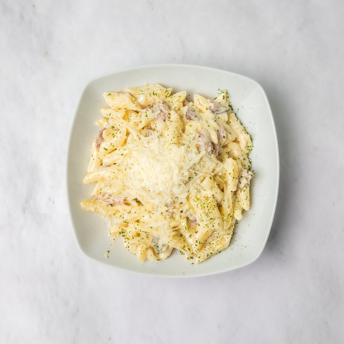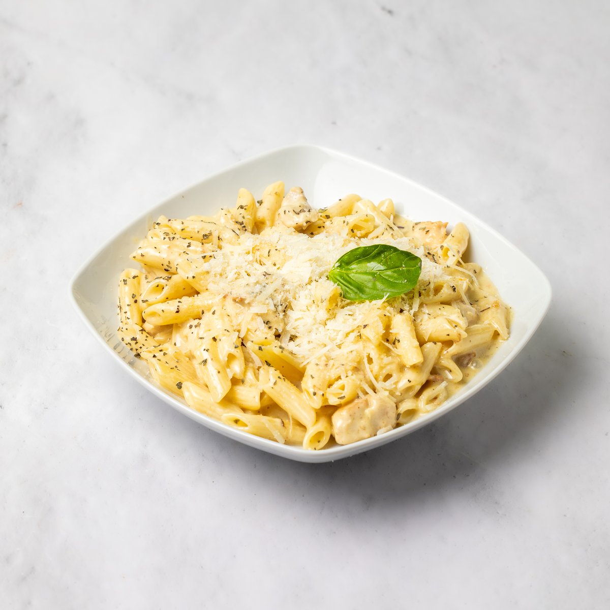 Maslinovo ulje, pileći file, neutralna pavlaka, sok od limuna, so, biber, bosiljak, testenina, parmezan