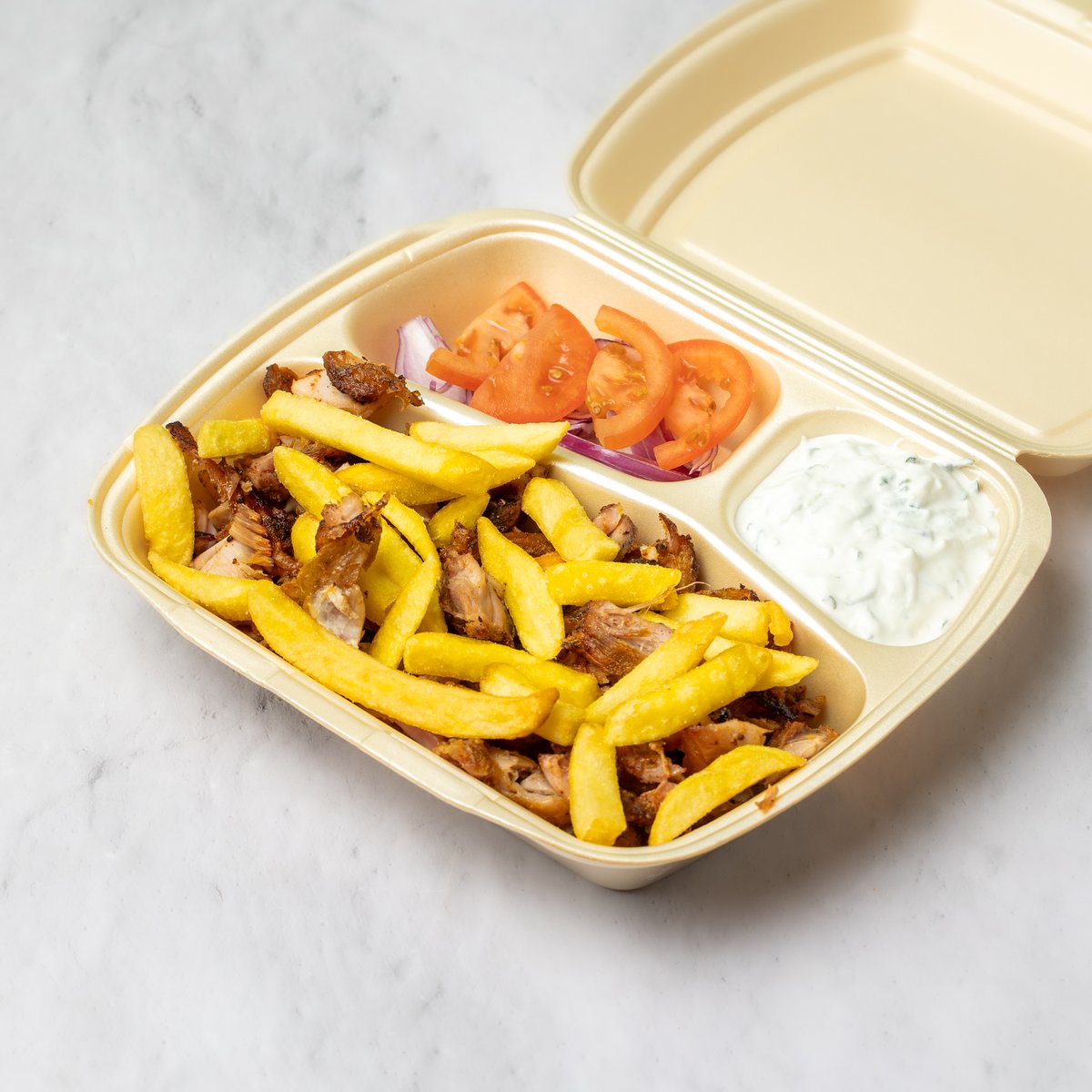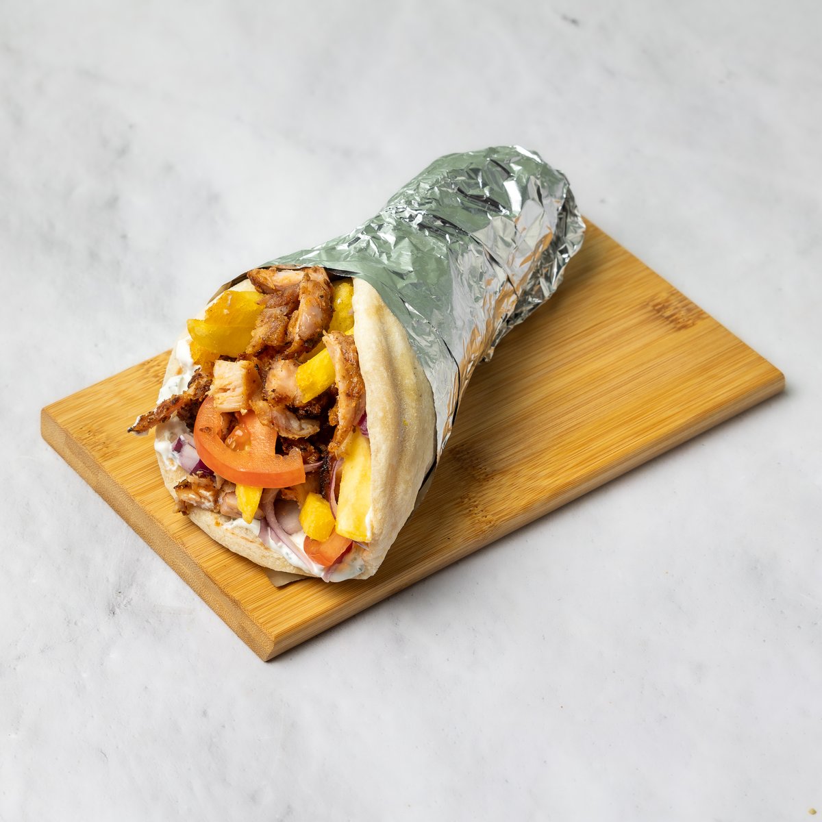 Tortilja, pil.meso, tzatziki, paradajz, crveni luk, pomfrit