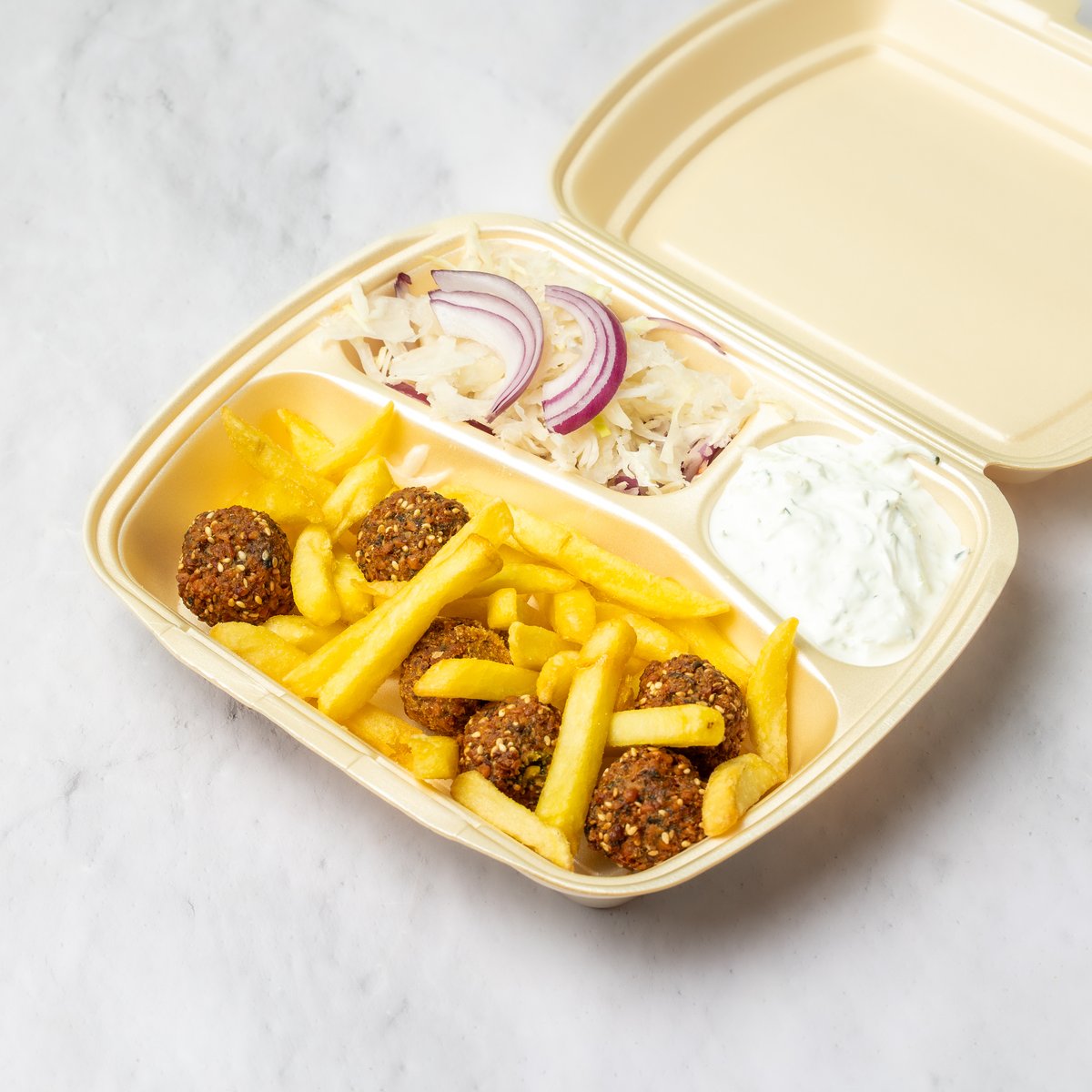 Tortilja, domaći falafel, tzatziki, svež kupus, crveni luk, pomfrit