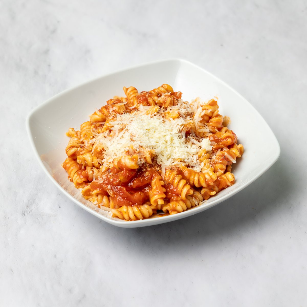 Maslinovo ulje, crni luk, beli luk u ulju, so, biber, napoli sos, svež paradajz, testenina, parmezan