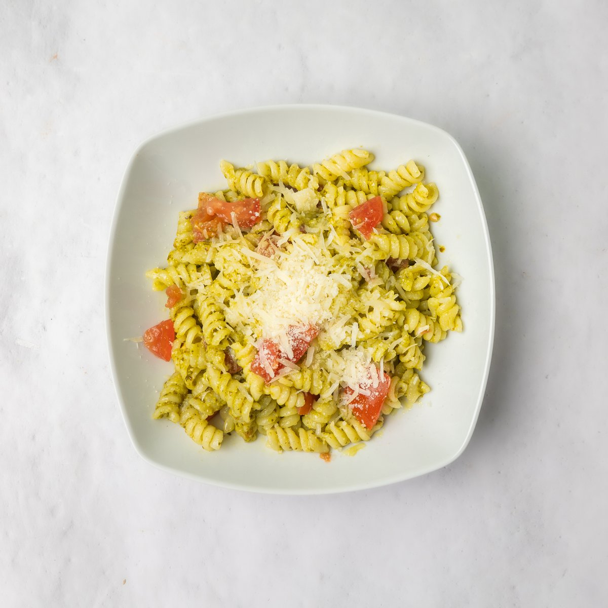 Maslinovo ulje, voda, pesto sos, testenina, so, biber, svež paradajz, parmezan
