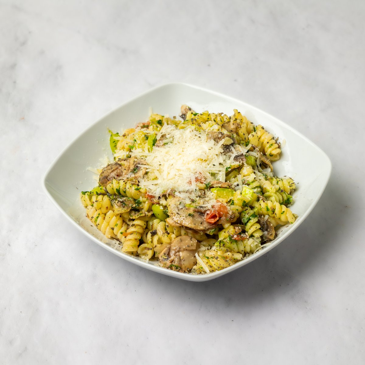 Maslinovo ulje, crni luk, pečurke, paprika, tikvice, spanać, paradajz, beli luk u ulju, sok od limuna, so, biber, bosiljak, testenina, parmezan