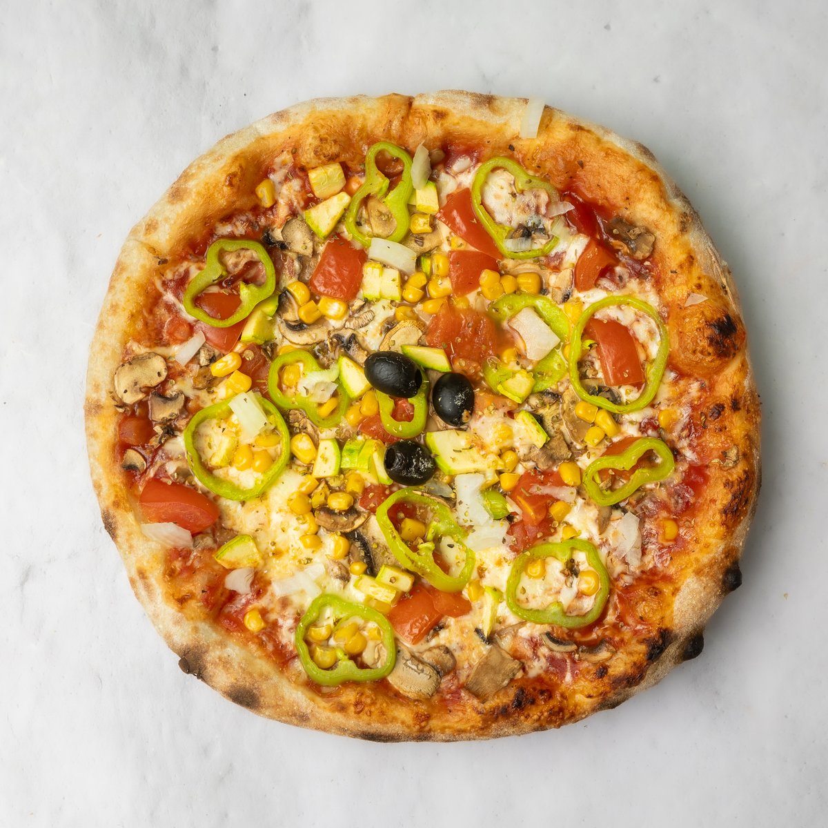 Plat, kačkavalj, pečurke, paprika, paradajz, tikvica, crni luk, kukuruz šećerac, masline, origano